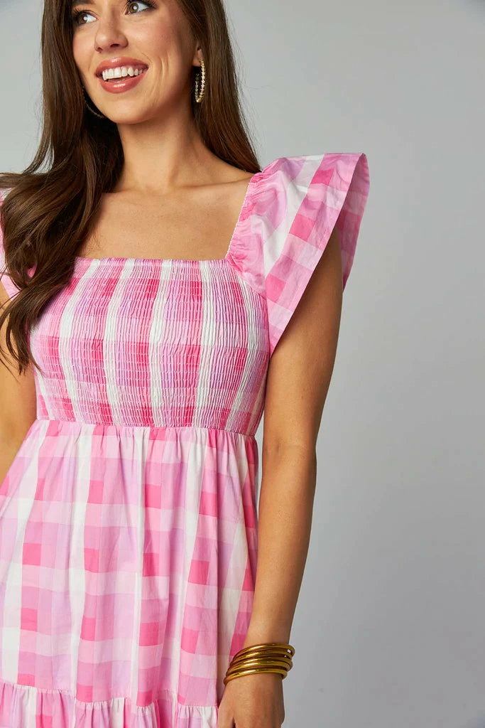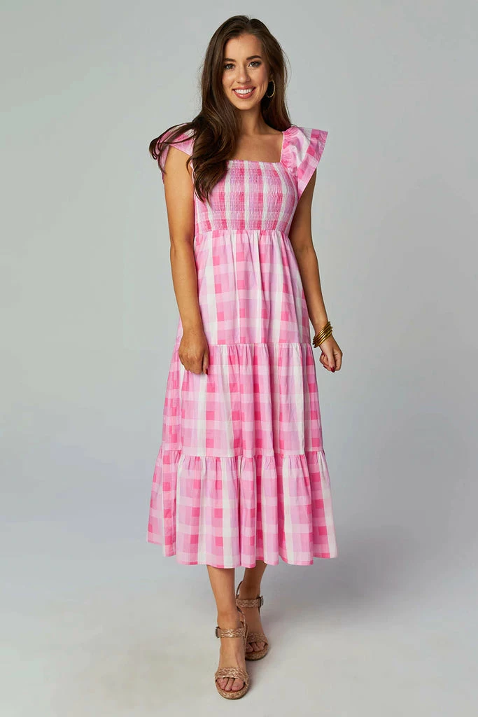 The Brynn will be your new fav dress! She features ruffle sleeves, smocking all across the chest, tiered layers on the skirt, and midi length, in a lightweight multi pink plaid fabric. Pair with wedges, a fun summer bag, and statement jewelry! Shop the matching youth dress for a perfect Mom and me day out: Youth Nori Dress in Bunny.