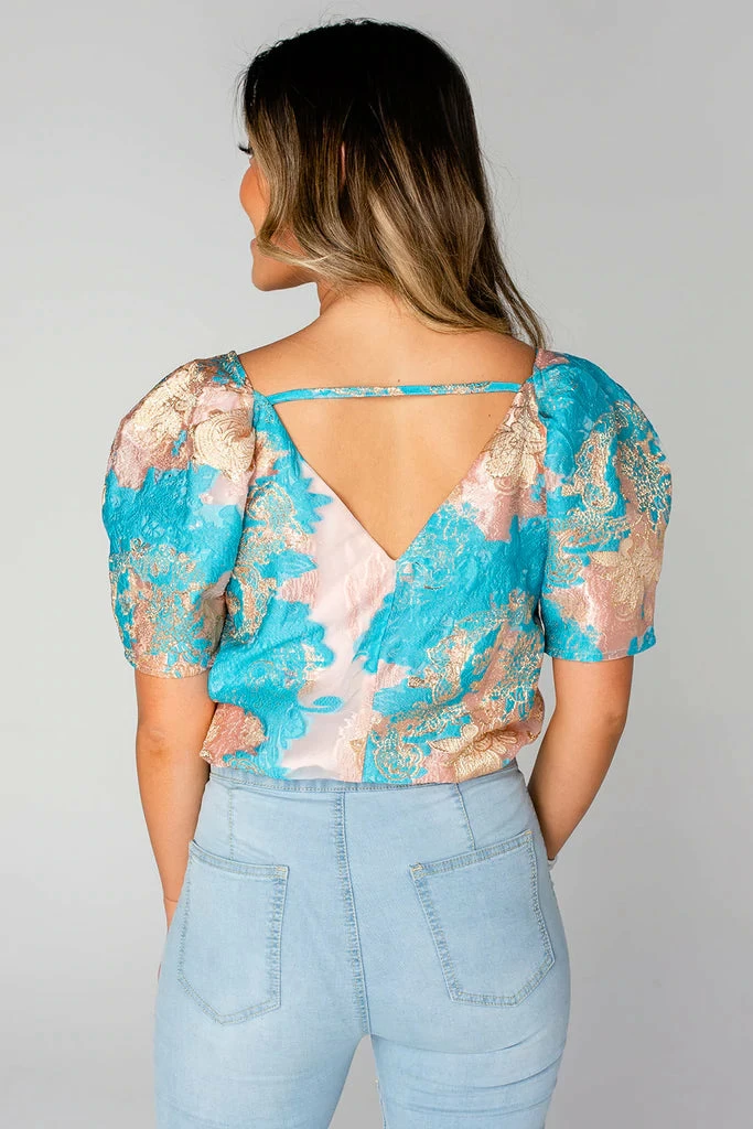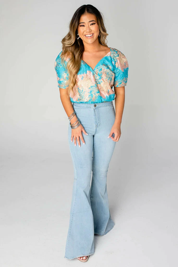 A #babecrew favorite for this spring season season! She is bold, fierce, and beautiful just like you! The Felicity features puff sleeves, a v neckline, front hook closures, back strap, and snap closure on the bottom. Pair with your best denim jeans and black booties! Colors: nude, teal, and metallic gold.