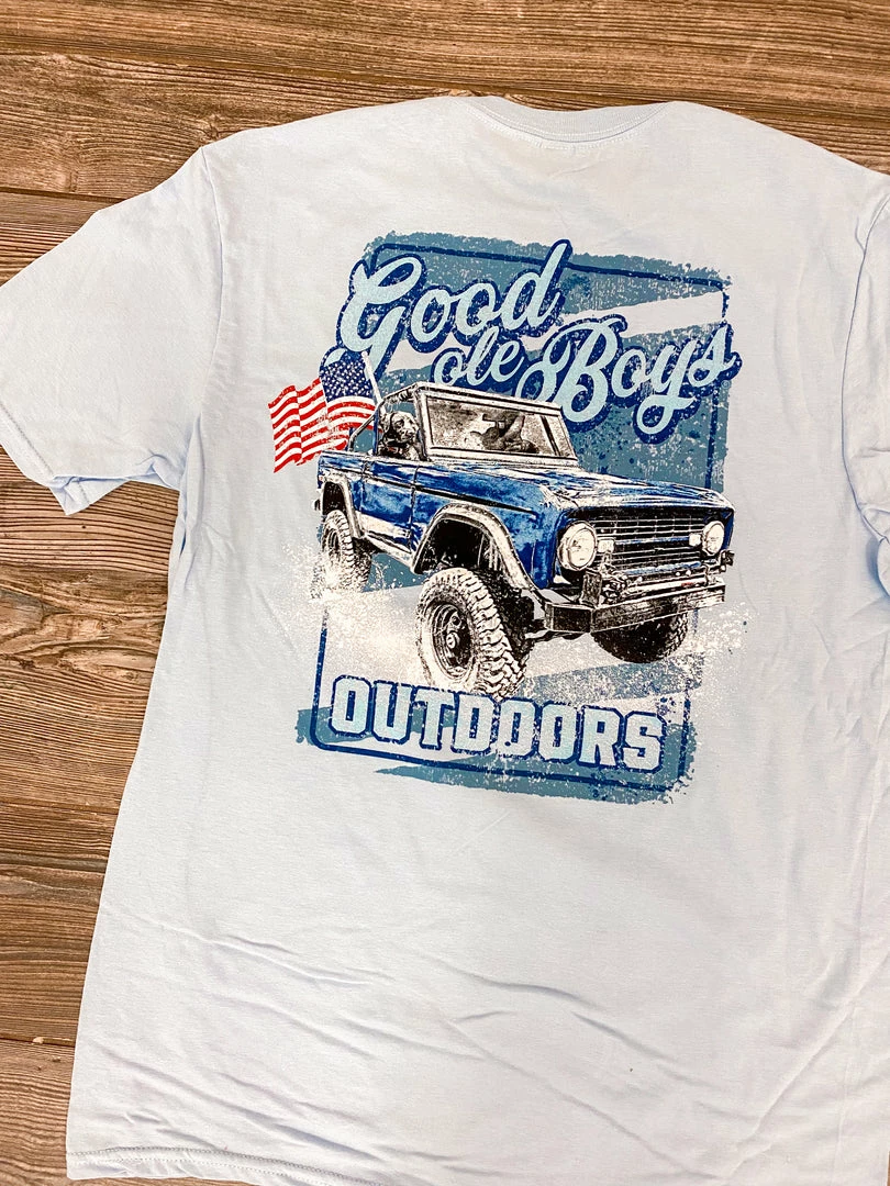 Good Ole Boys Mens T Shirt. Bronco with lab and american flag flying baby blue short sleeve