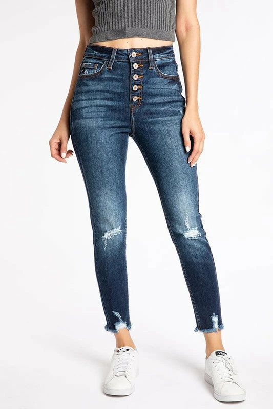Dark wash high rise button fly skinny jeans with frayed hem at the ankle