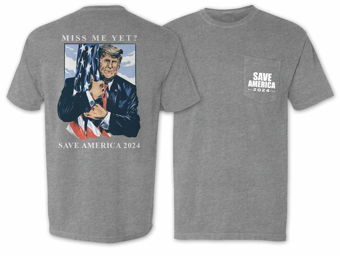 Old Row Save America Trump 2024 t shirt. Short sleeve t-shirt with a chest pocket