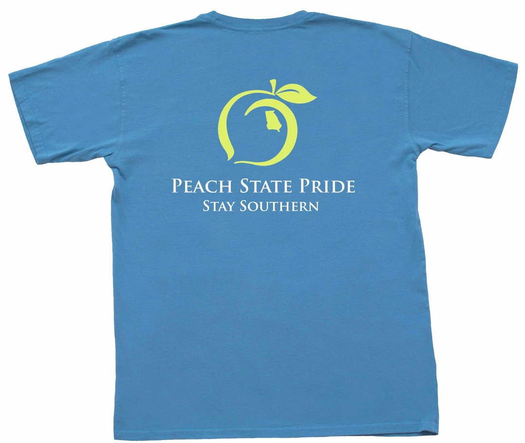 The classic stay southern Georgia peach t shirt in this fun color for summer! Marina blue t shirt with a lime peach. Front pocket t shirt.