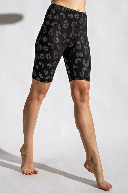 These super stylish high rise athletic biker shorts are sure to make you happy! Black shorts featuring a silver animal dot foil print pattern, high waistband, a hidden front keyhole pocket, and yoga stitch details. You’ll feel comfortable and fabulous while working out or running errands. Just add a sports bra or a cute tee and sneakers and you’re all set!Â