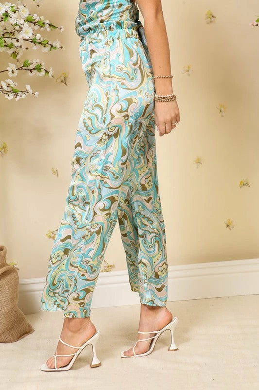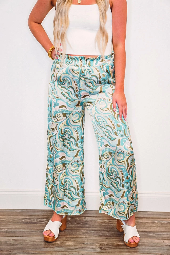 These lightweight aqua satin pants are perfect for everything from running errands to day dates. Pair with our Simple Days Tank and your favorite sandals or wedges for an easy but trendy look. Featuring an elastic highwaist and paisley print colors of aqua, lime, olive, light blush, sky blue, ivory, and pale yellow.Â