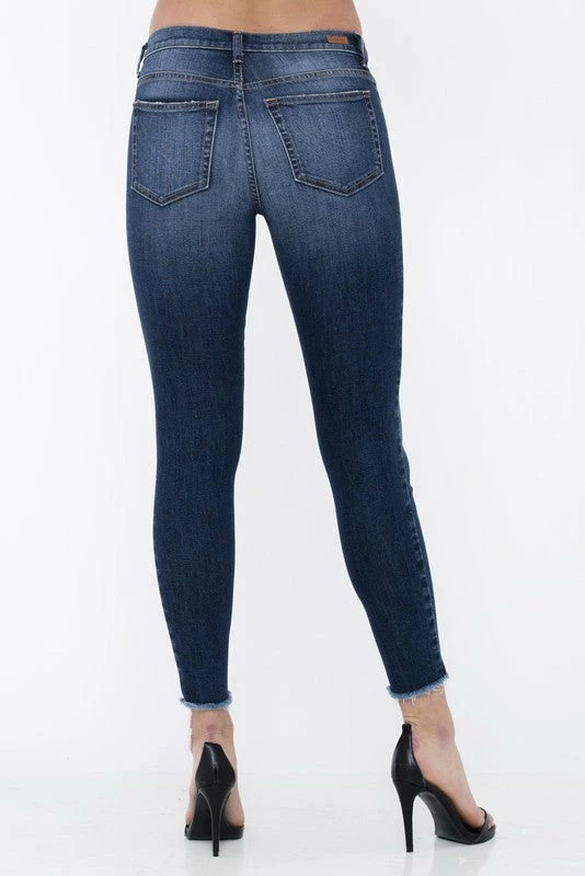 LIGHTLY DISTRESSED MID RISE SKINNY JEANS WITH AN UNFINISHED HEM
