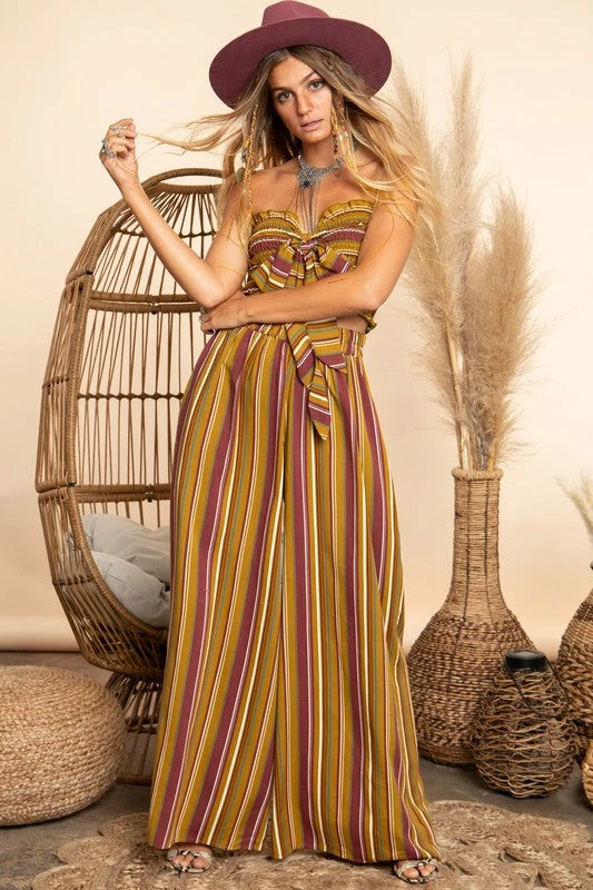 We are feeling all the Boho feels for this pretty baby! Adorable two piece set, with strapless smocked top, and the prettiest flowy pants. Absolutely perfect! The smocked top has a ribbon tie detail on the front, and the flowy pants have an elastic waistband, and pockets. This sweet set is definitely one of our favorites! The trendy Boho style combined with the color mix of mustard, burgundy, ivory and blue will be a perfect transition piece right into Fall. We know you’ll feel fabulous everywhere you wear her!