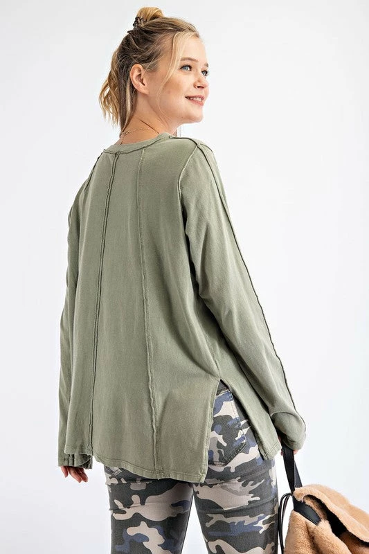 We are having all the love for this boxy knit pullover top! So comfy, and super cute, featuring mineral washed sage knit, crew neckline, raw seam details, long sleeves, and side slits in the bottom hemline for added comfort. You will love how great you feel in this babe, while running errands, hanging out with friends, or enjoying a much deserved day off. Soon to be your new favorite go-to!