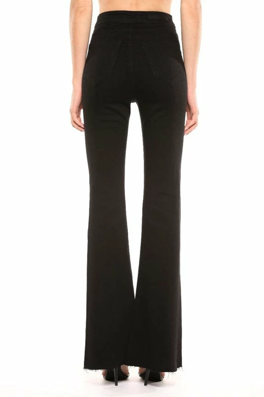 Take a cue from an earlier decade and get your groove on in these high rise super bell bottoms that fit slim before flaring out dramatically at the knee. Its rich color wash elevates the quality of the jeans. Additionally equipped with two back pockets and no belt loops for creating a slimmer silhouette. Features a raw hem..perf for trimming to your need!