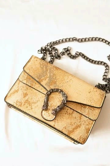 The added accessory you did not know you needed! This gorgeous champagne chain purse is just too cute! Features a magnetic snap closure, 3 inside compartments – middle zipper to separate.
