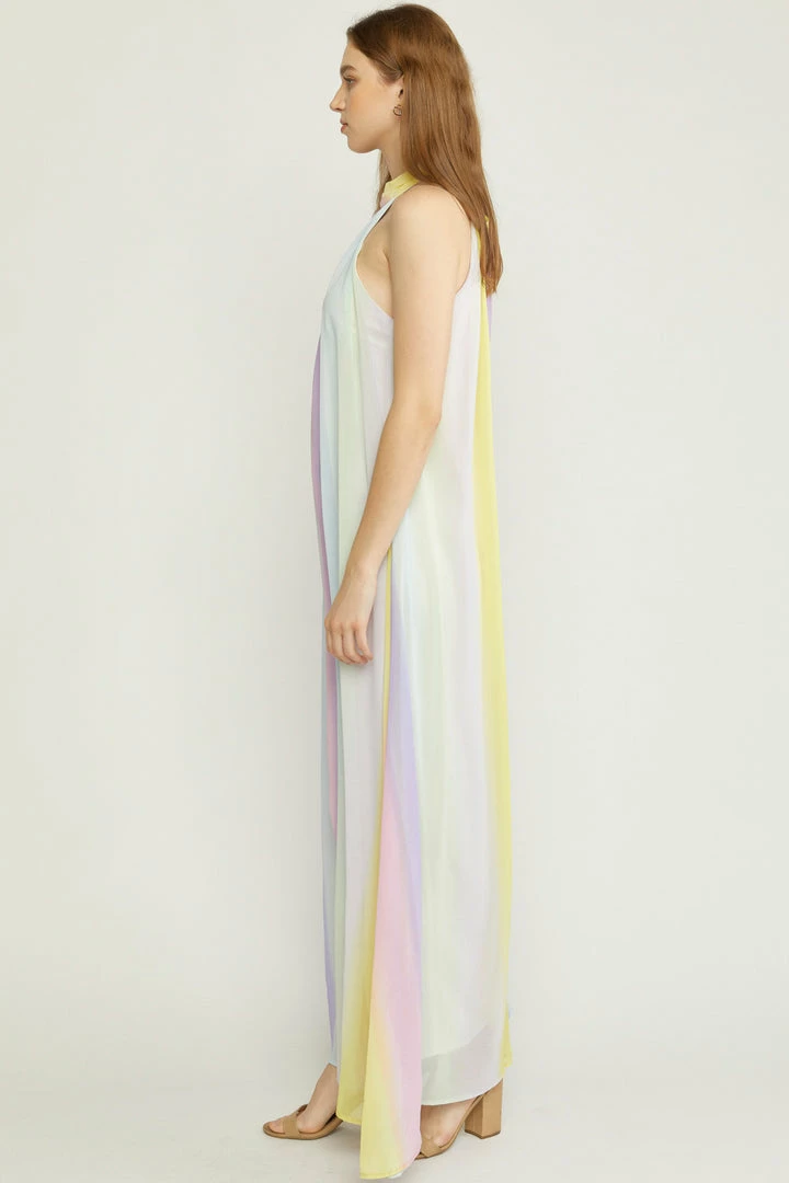 We are crushing hard on this rainbow jumpsuit! Featuring halter neckline with self tie in back, zipper back closure, and lightweight flowy fabric. So perfect for all of your upcoming Spring and Summer events. So pretty! Pastel colors: lavender, yellow, pink, orange, and mint.