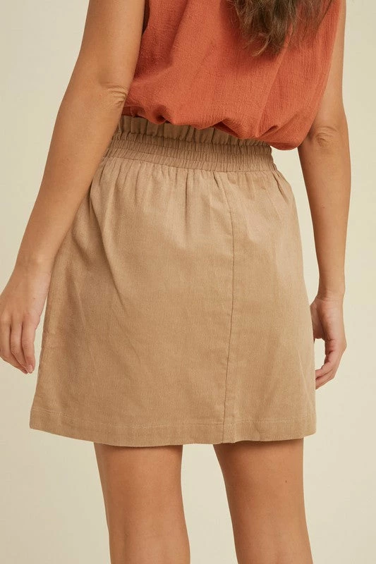 We are in cuteness overload with this classic tan corduroy mini skirt! She is definitely a fan fav featuring a ruffled elastic waistline, and front pockets. Super cute and fun! Perfect for a classic styled look, or throw her on with a graphic tee, denim jacket and boots for a more edgy look.Â