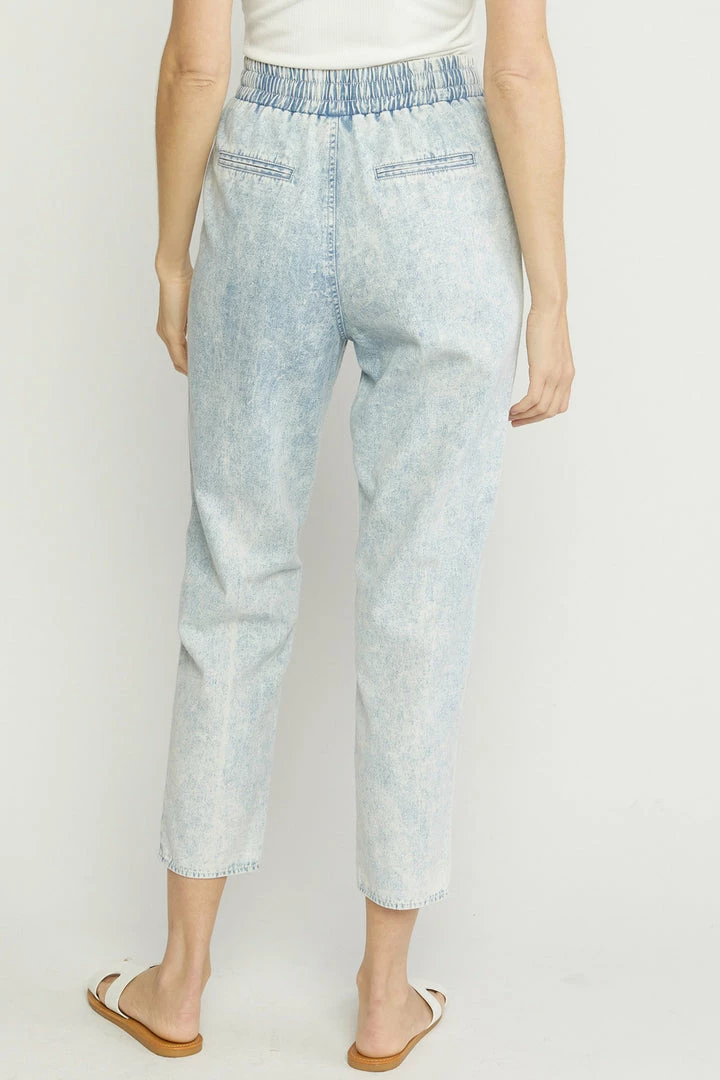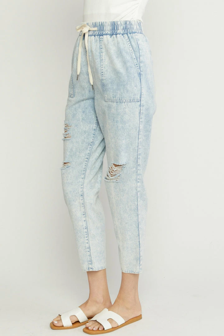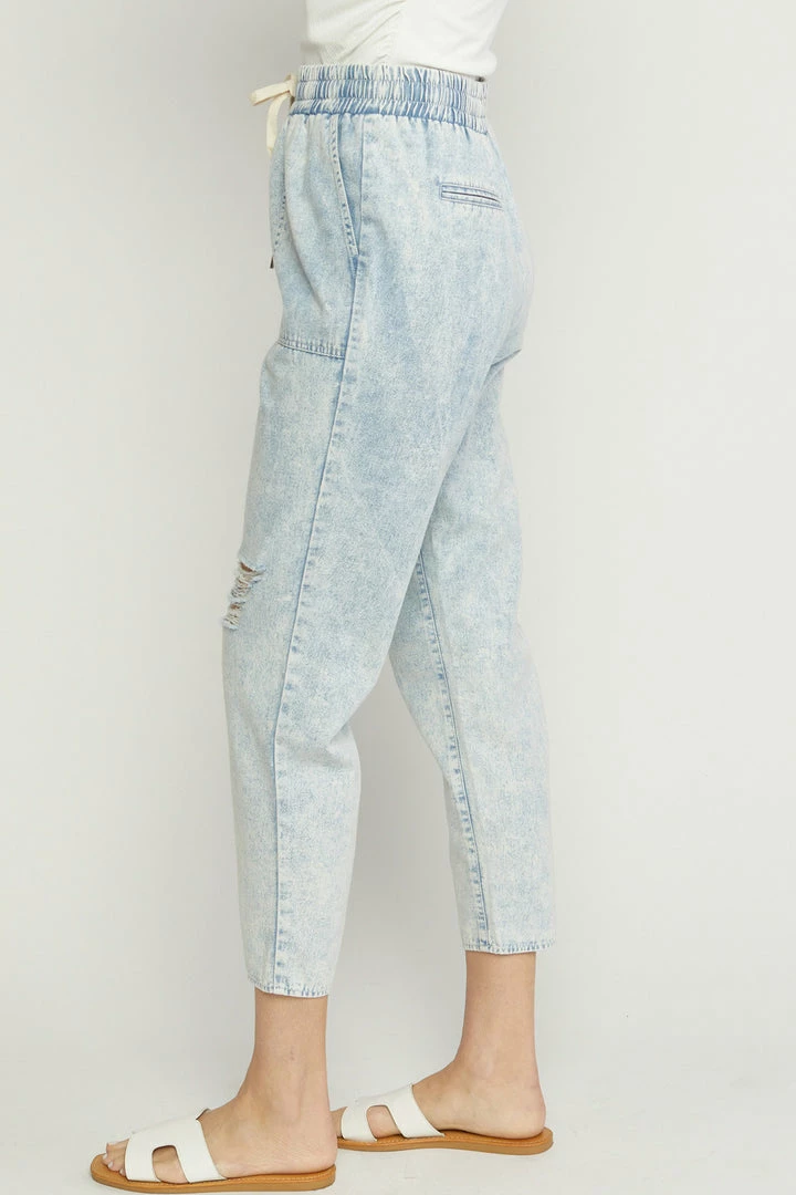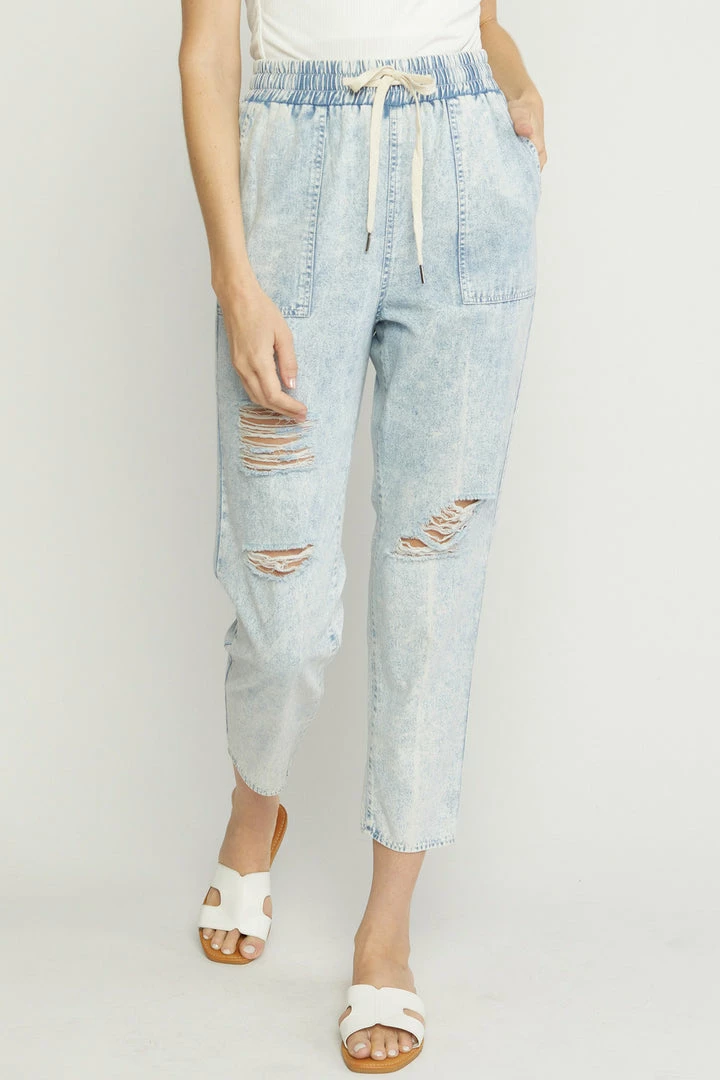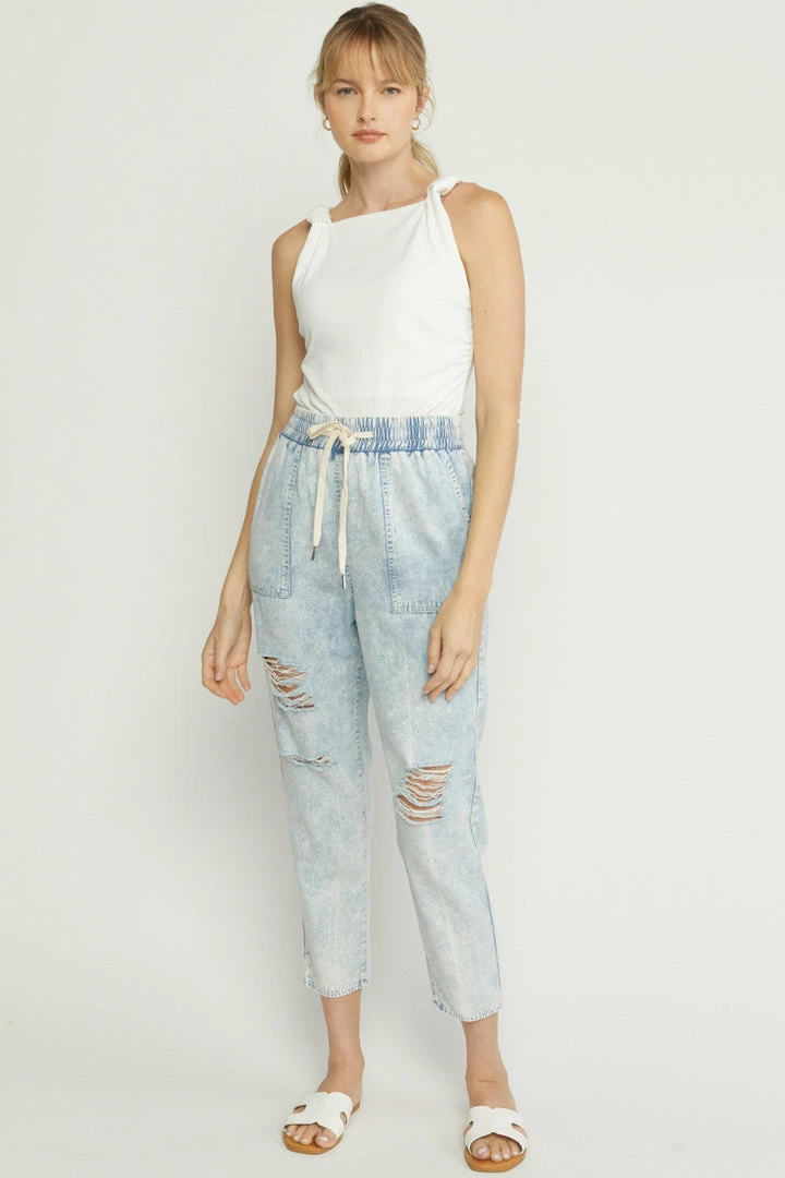We love a good pair of distressed jogger pants, and these babies are super cute! They are a light weight denim in light blue, with a drawstring elastic waistband, are slightly tapered at the ankle, and have just the right amount of distressing. They have functioning pockets in the front and faux pocket details in the back. These babes will have you feeling so comfy while looking fab, you’ll want to wear them everyday!