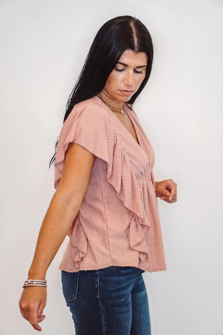 Oh my goodness, this top is pretty! Dusty pink solid dot blouse, with oversized ruffle cap sleeves, V neckline, and an open back with an adjustable tie closure. Featuring an elastic waistband for a fitted silhouette, and lightweight fabric for a flowy feel. This top has it all! The dusty pink color is so flattering, you’ll want to wear this cutie everywhere!