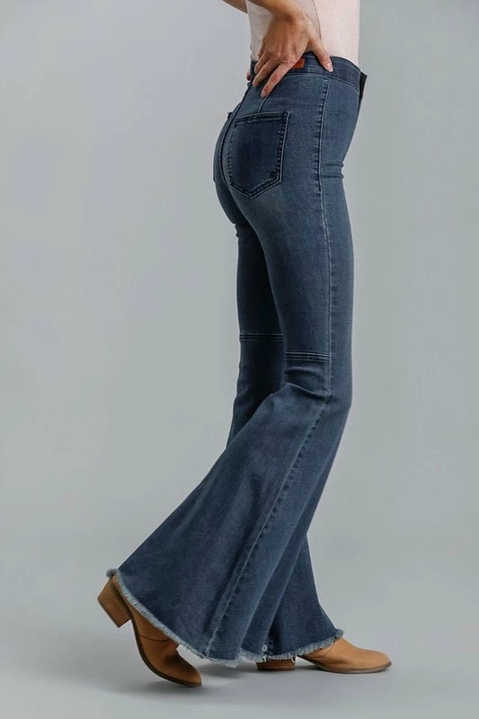 Love these denim flares! So comy yet so trendy! An instant classic, these super soft flares have a stretchy fabric that is designed to accentuate your shape while taking your look to the next level. Featuring a zipper with double button closure, high rise waist, pockets in the back, a seam detail in the back just above the knee, and a fringed raw edge hemline. They are such a flattering fit!