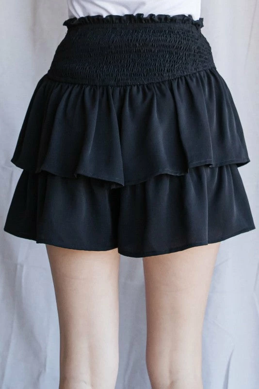 Black smocked ruffle layered shorts