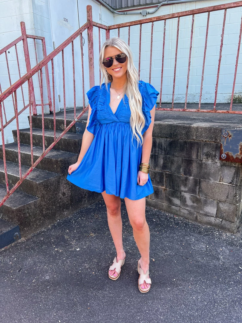 This super cute cobalt blue dress will have you dancing all night long! This little babe features a v neckline, short flutter sleeves, pleated top, an open back with self tie closure, hidden side zipper, and an empire waist with pleated skirt. So perfect! This cutie will take you from warm Spring days right into those hot Summer nights. Grab her quick, this one won’t last long!