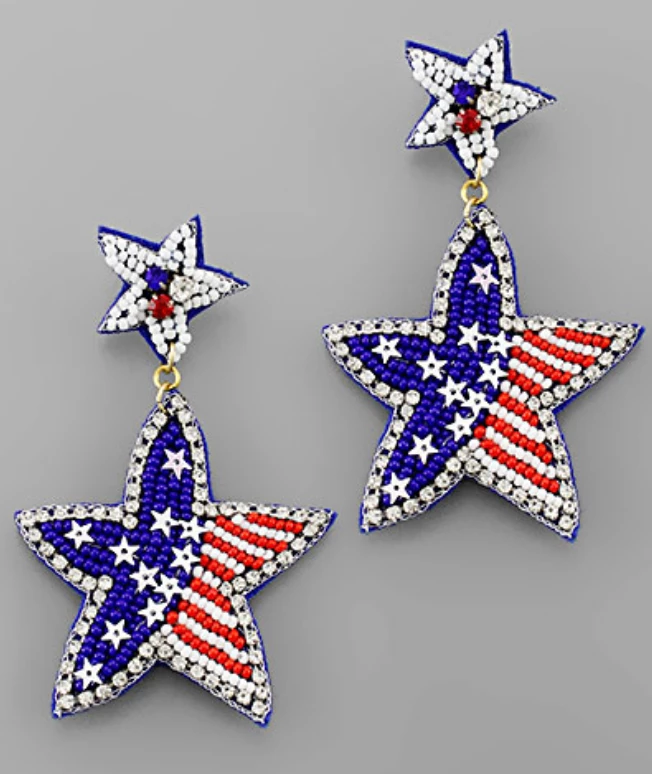 The cutest red, white and blue earrings for any 4th of July or Memorial day event! They are fully beaded and so much fun. They even have “diamonds” lining the outside frame. So patriotic!