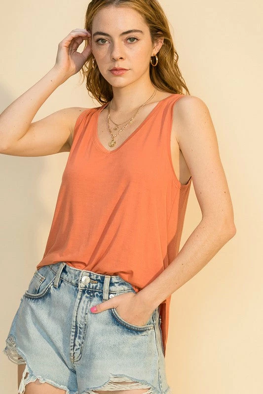Soft to the touch tank top! The tank that you can casually wear with your denim cut offs but you can also totally dress this tank up. V neck and curved hem on the sides.