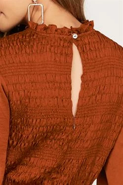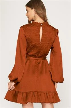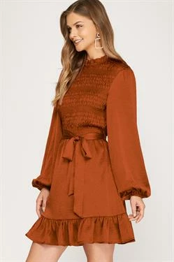 We are here for this one girls! Smocked satin dress, in a very pretty dark rust color. Featuring a smocked top and flowy bottom, a ruffled high neckline with button and zipper closure in back, elastic cuffed long sleeves, a self tie sash at the waist, and a ruffled hemline. This beautiful babe is fully lined, and the fit is very flattering Perfect for any special occasion, from Wedding events, to Holiday parties, and the color will transition beautifully into the upcoming seasons.Â