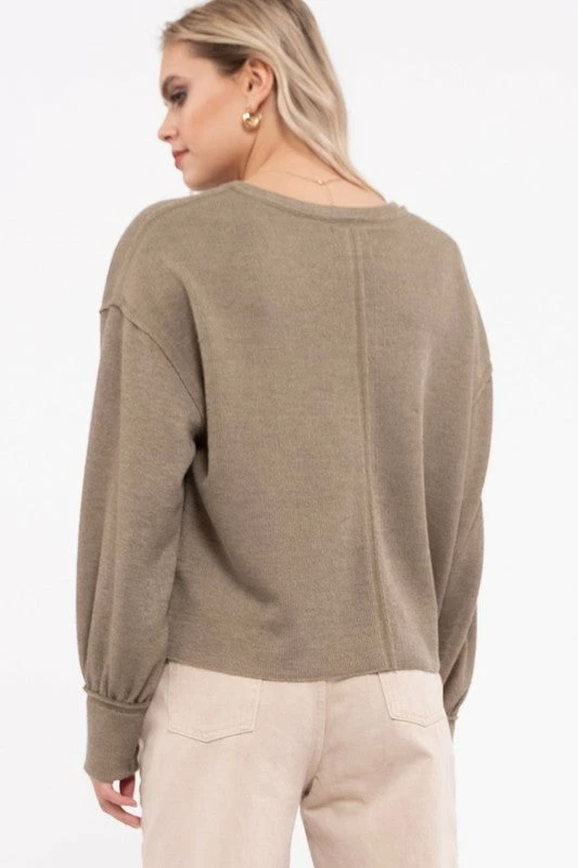 Casual yet on trend! This light olive knit top is most definitely at the top of our wish list. Features a soft light weight ribbed knit fabric, crew neckline, raw hemlines, and cuffed long bubble sleeves. The relaxed fit is comfy as well as flattering, and looks great on all body shapes!Â