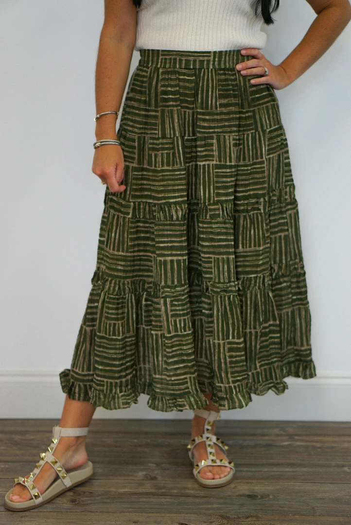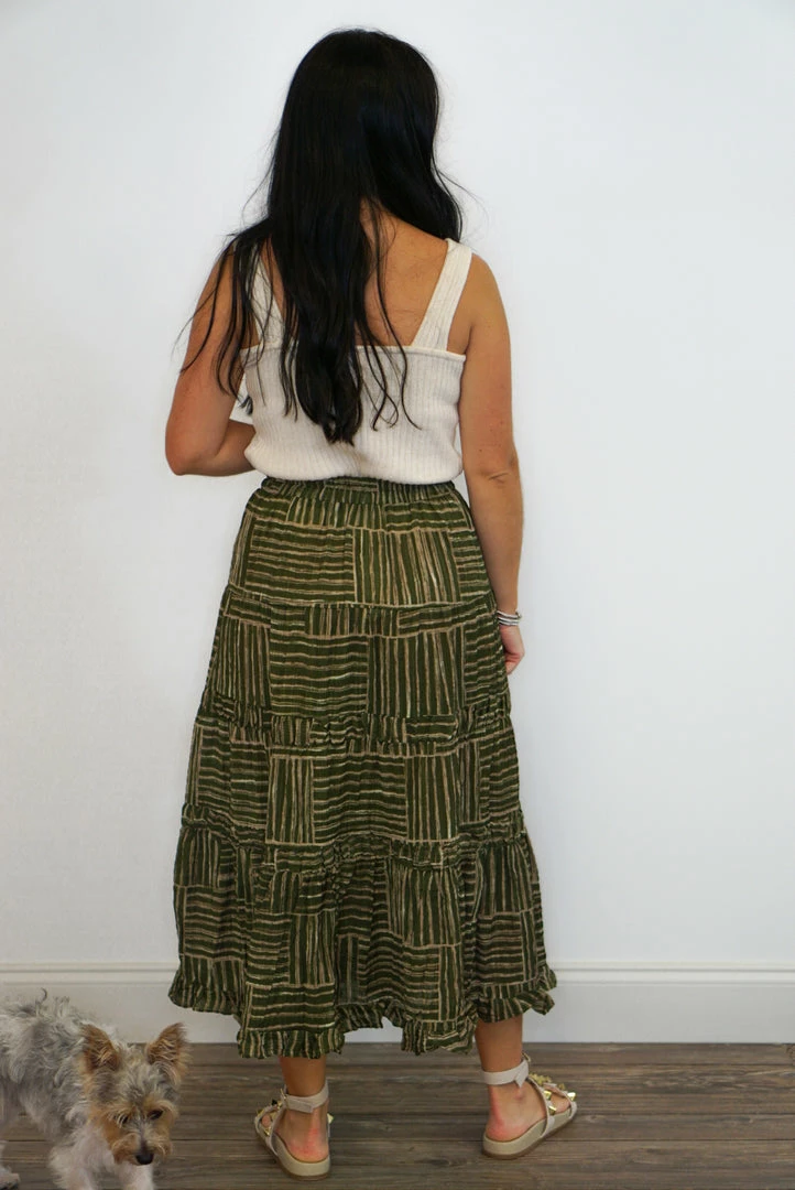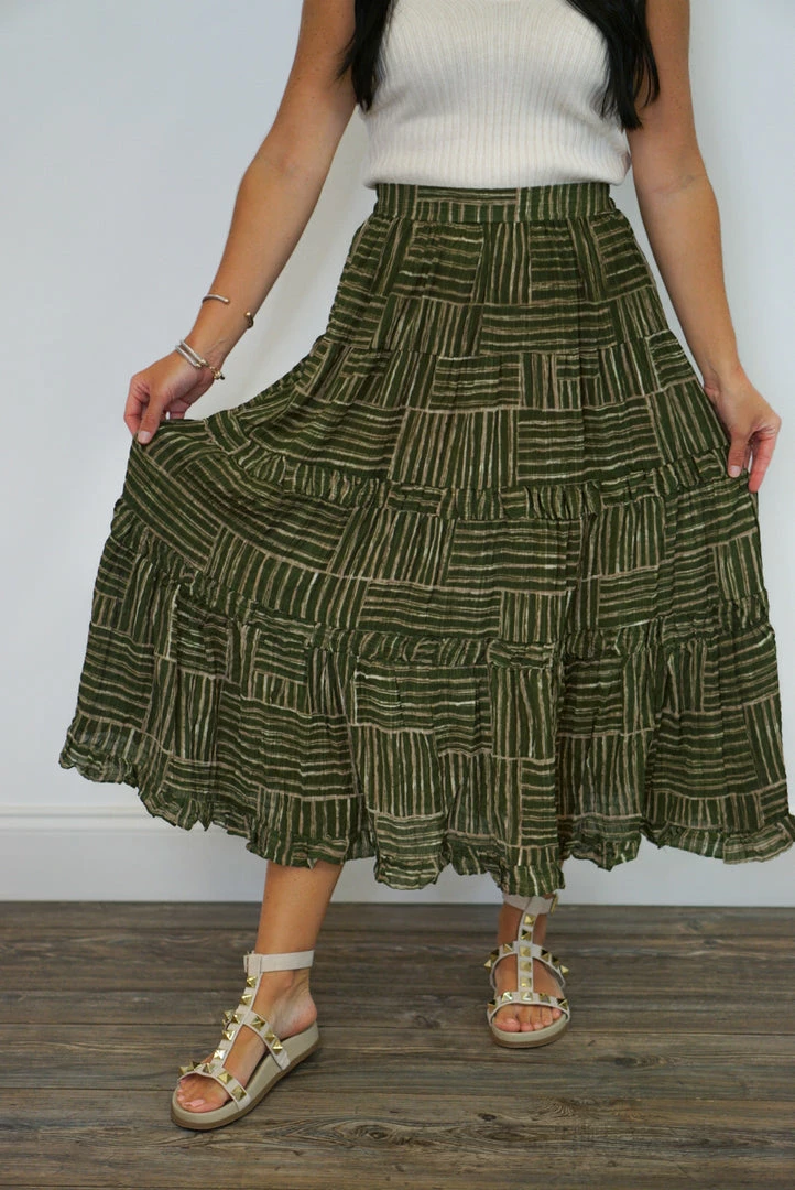 Olive and taupe tiered boho style midi skirt
