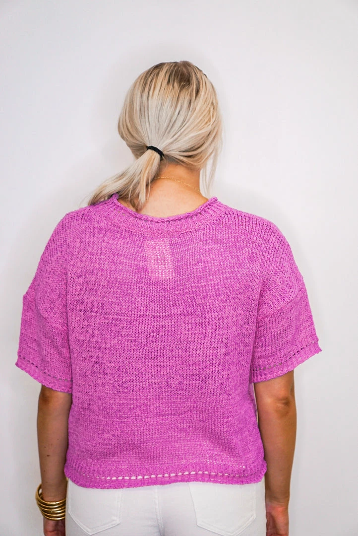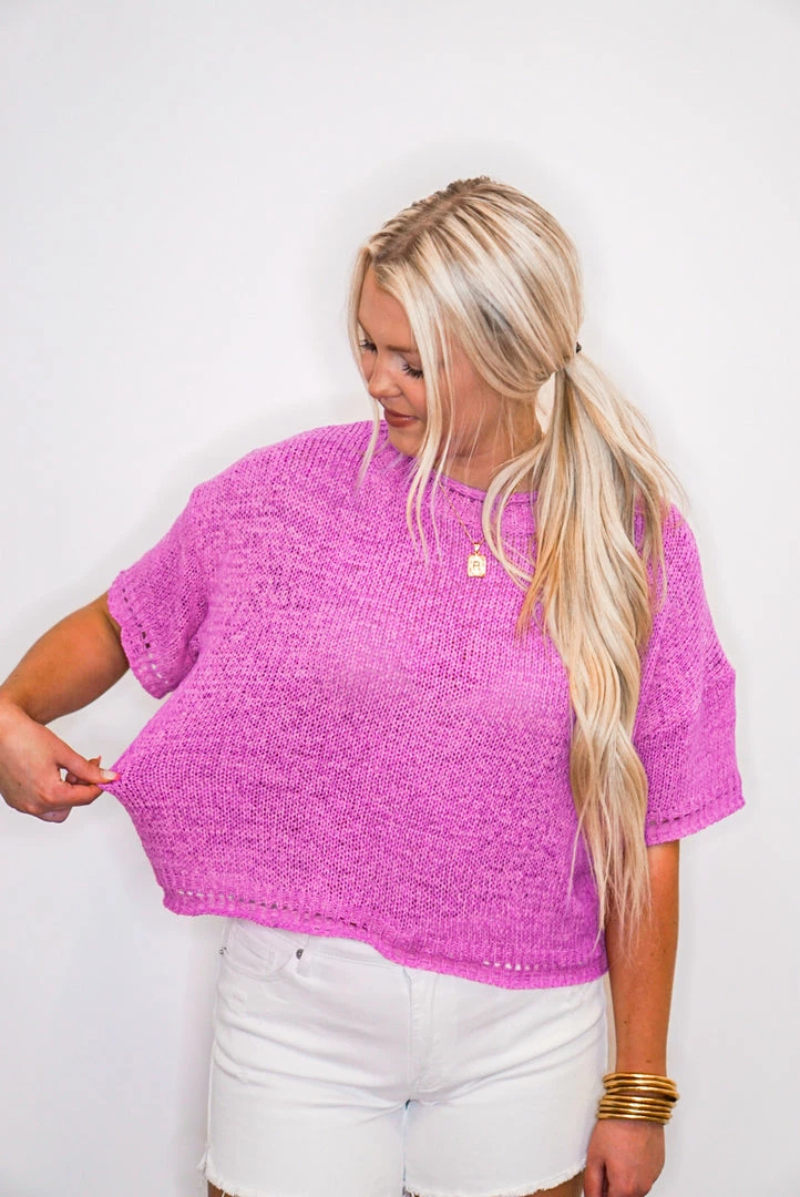 There is such a comfy classic feel to a loose knit Summer top. This cutie is an orchid lightweight loose knit fabric, featuring a ribbed crew neckline, and dropped shoulder with ribbed cuffed short sleeves. Perfect for those warm Summer evenings at the beach!Â