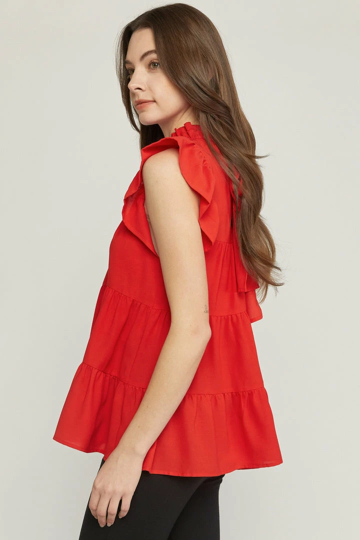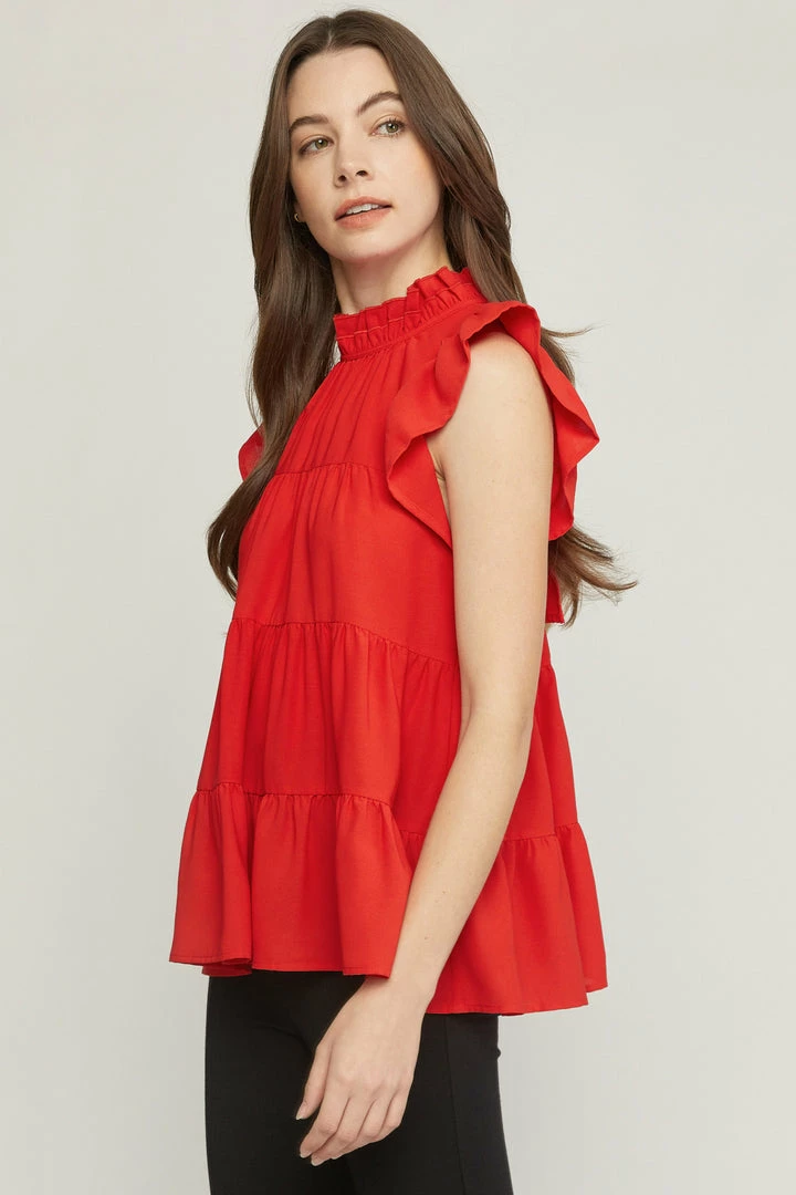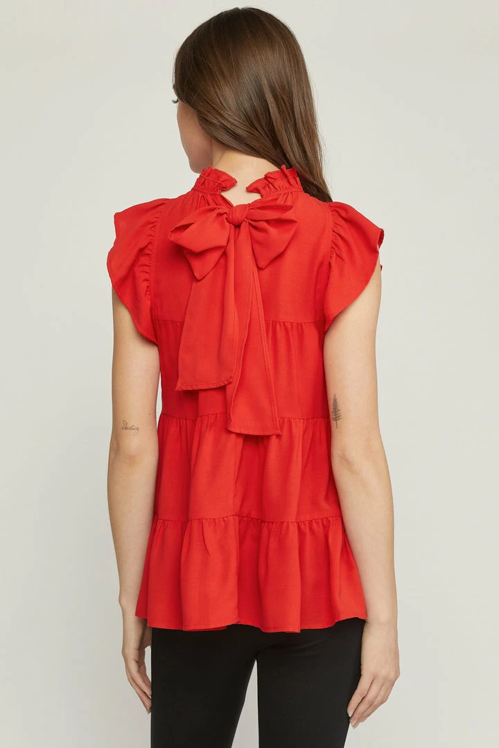 The perfect little top for all of your upcoming occasions… just add your favorite jeans and sandals or booties and you’re set. Solid top with a ruffled mock neckline that ties in the back, ruffled cap sleeves, and tiered layers. So cute!