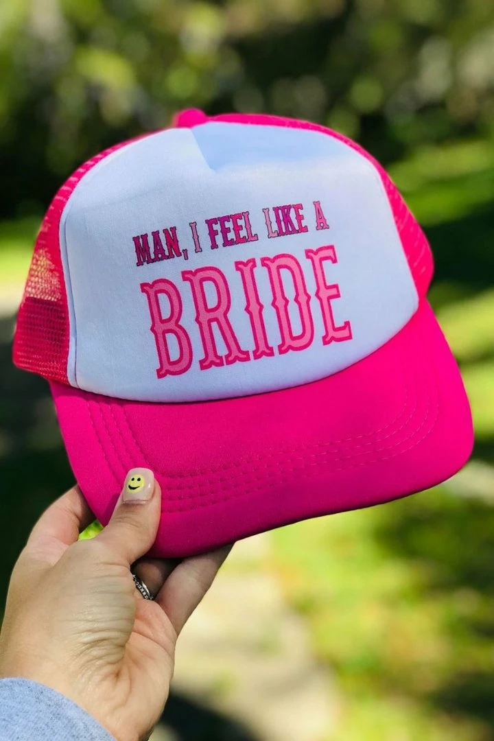 Let your inner Shania Twain show in the cutest Man, I Feel Like A Bride pink and white trucker hat. Would be SO CUTE for your Nashville bachelorette trips.