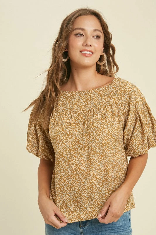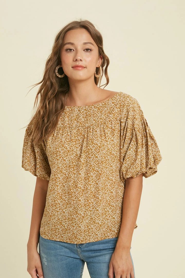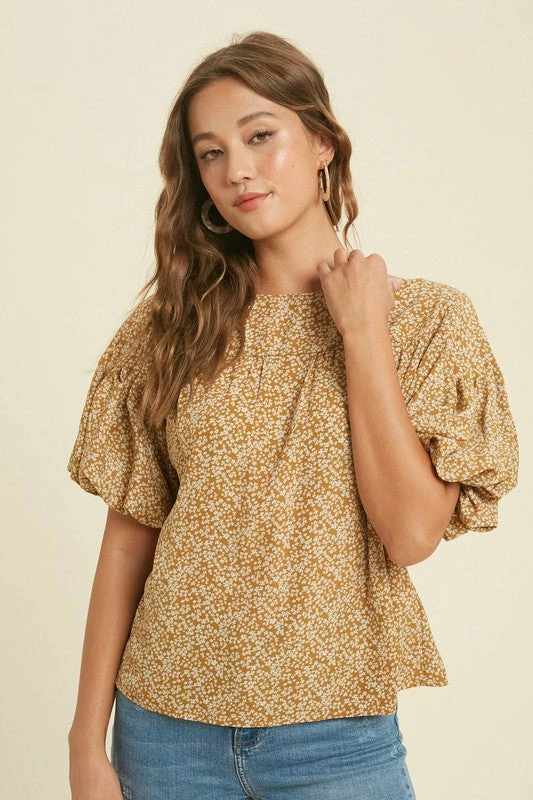mustard floral print puff sleeve dressy top