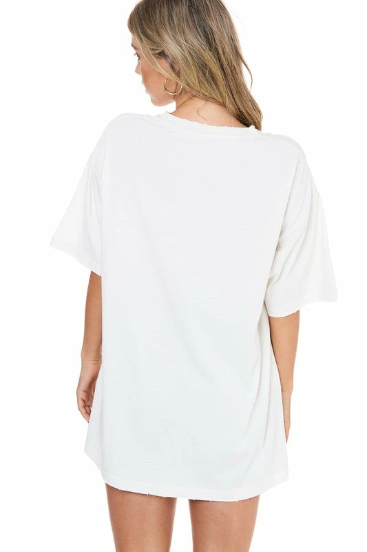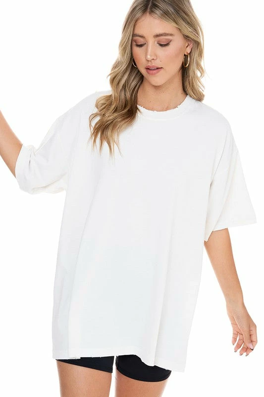 Trendy little must have tee! Solid ivory t shirt featuring an oversized fit, crew neckline, short sleeves, and distressed hemlines. This babe is perfect worn alone over biker shorts, or layered under your favorite blazers and kimonos!