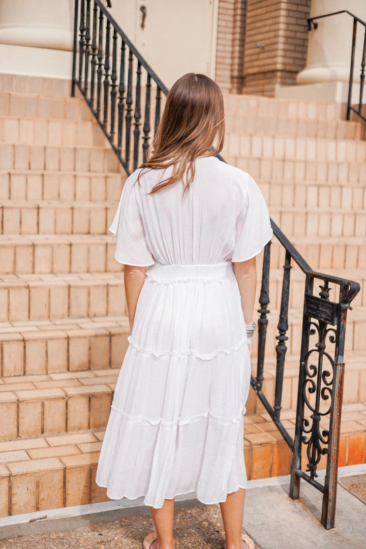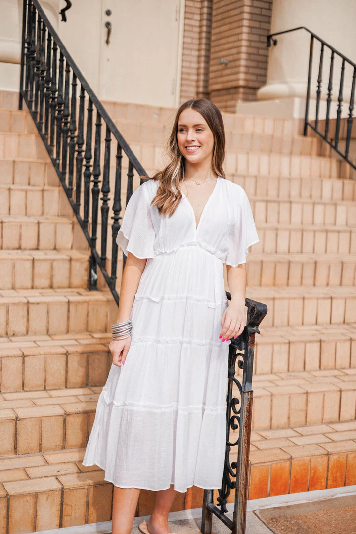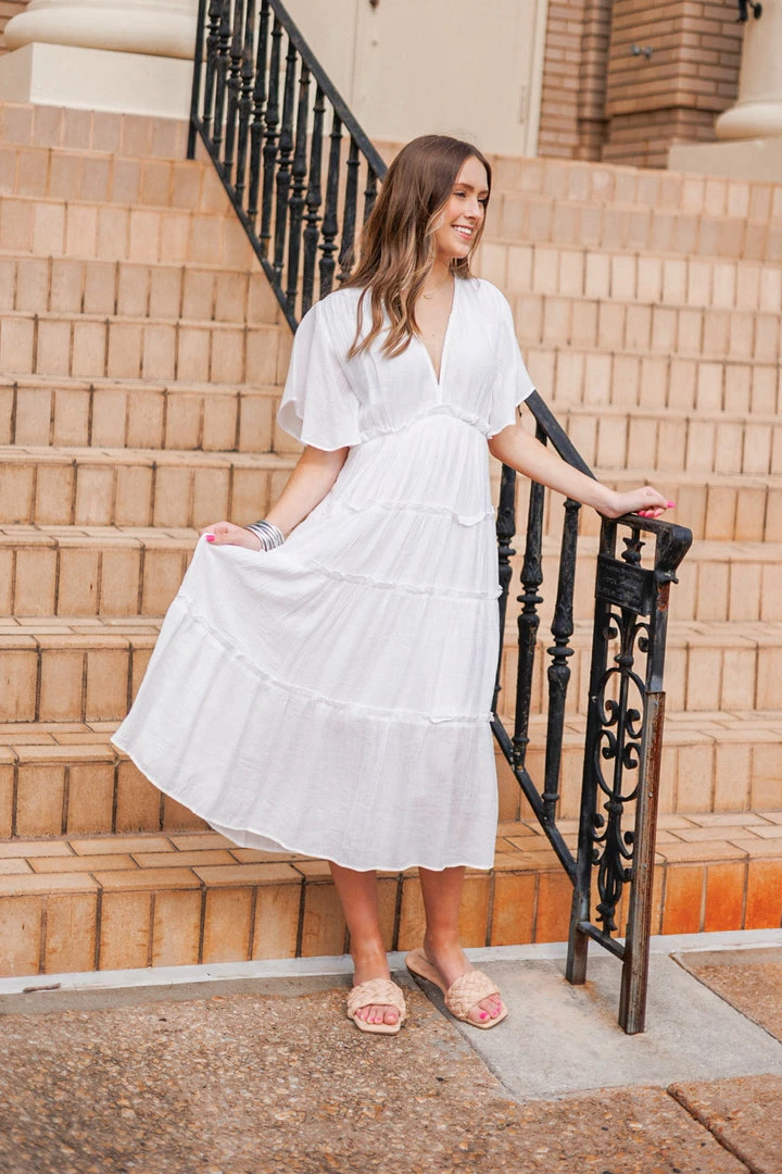 This super cute flowy tiered midi dress features a very pretty off white fabric, with a v neckline, short flounce sleeves, ruffle tiered layers, empire waist in front, and smocked waistband in the back. The perfect dress for all of your upcoming occasions!