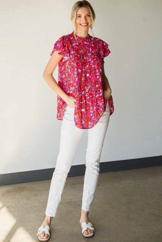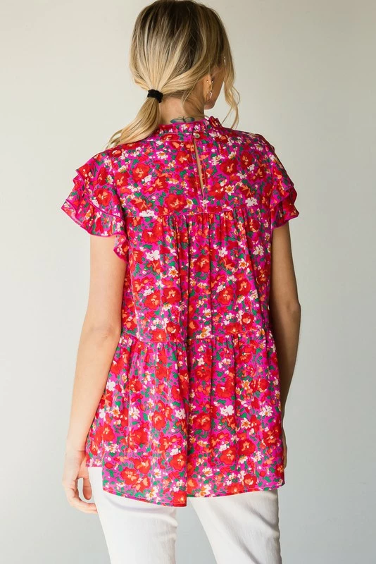 The perfect little babydoll top for all of your upcoming occasions… just add your favorite jeans and wedges and you’re all set. Simple yet fabulous! Hot pink top with floral print, featuring a ruffled mocked neck with keyhole button closure in back,ruffle capped sleeves, and tiered layers. So cute!
