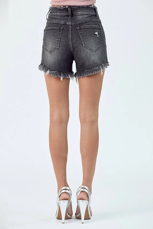 Risen high rise distressed washed black denim shorts.