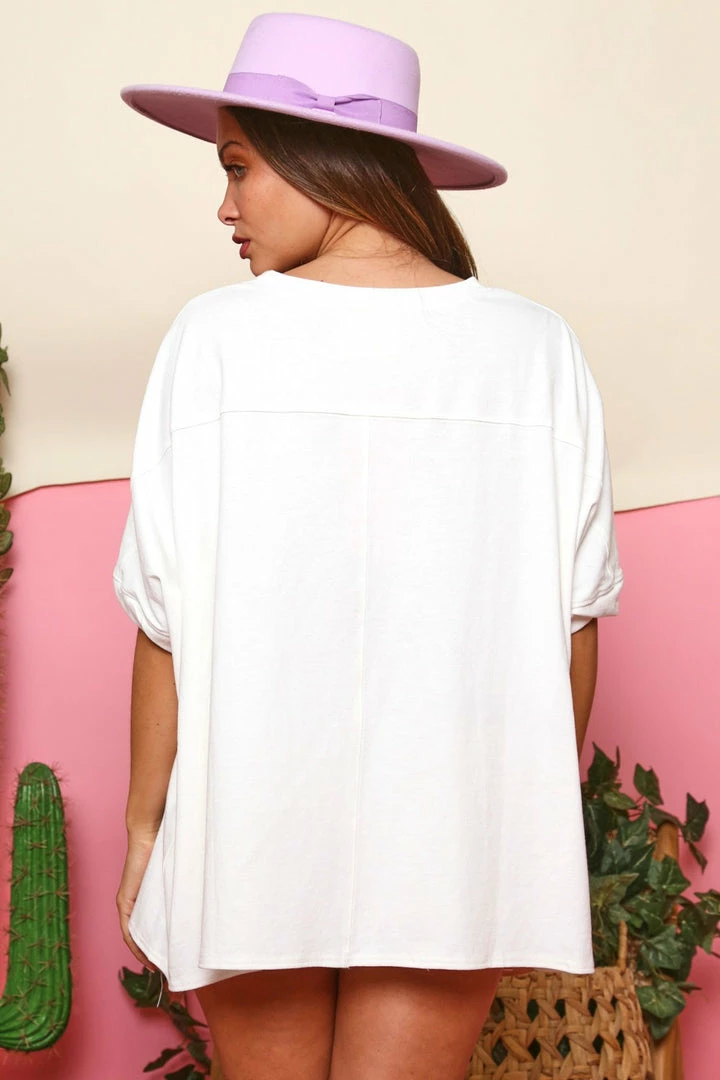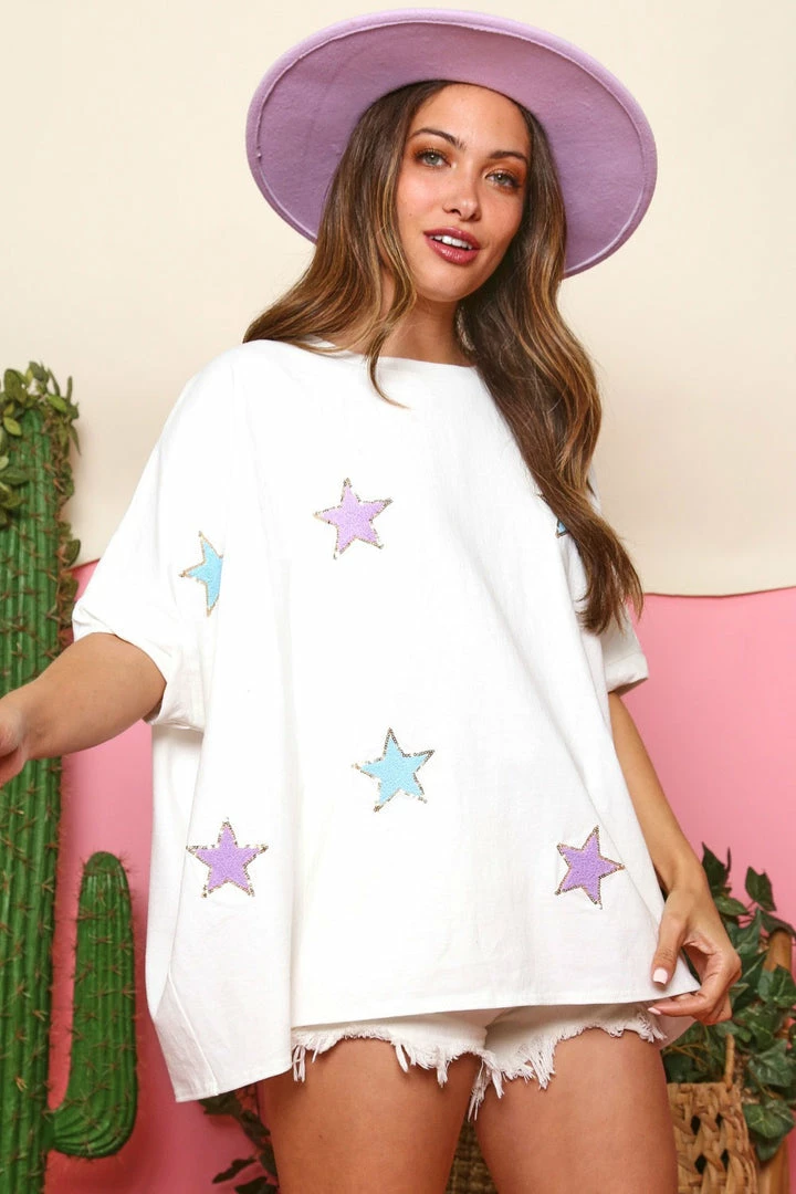 We love the oversized fit of this must have top and the patched stars decorating the front of it. This top is super cute styled with biker shorts or denim cut offs and sneakers. Star patch knit top with a round neckline, short sleeves, and loose fit.Â