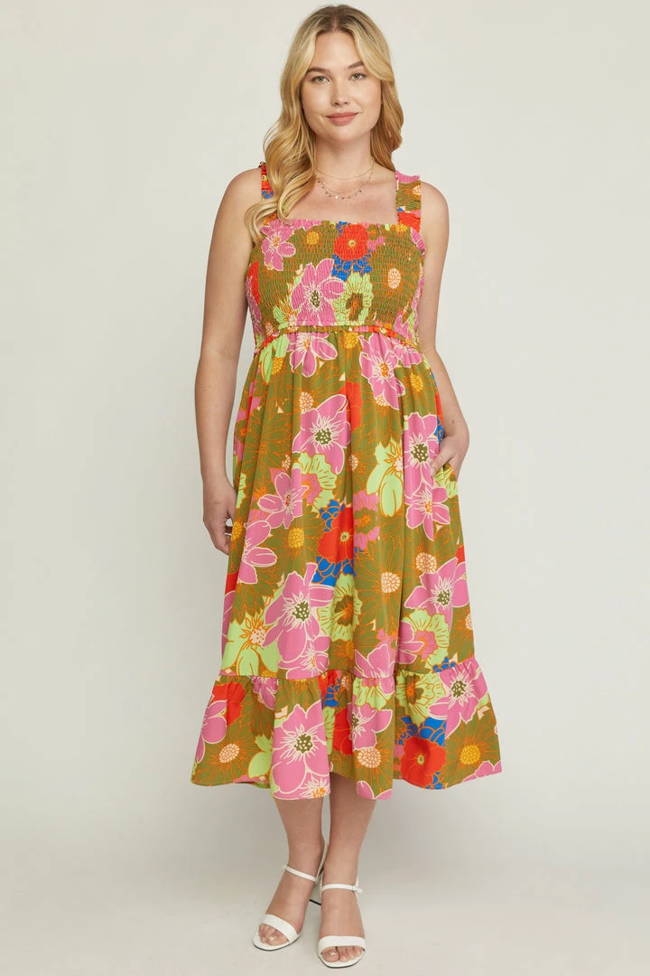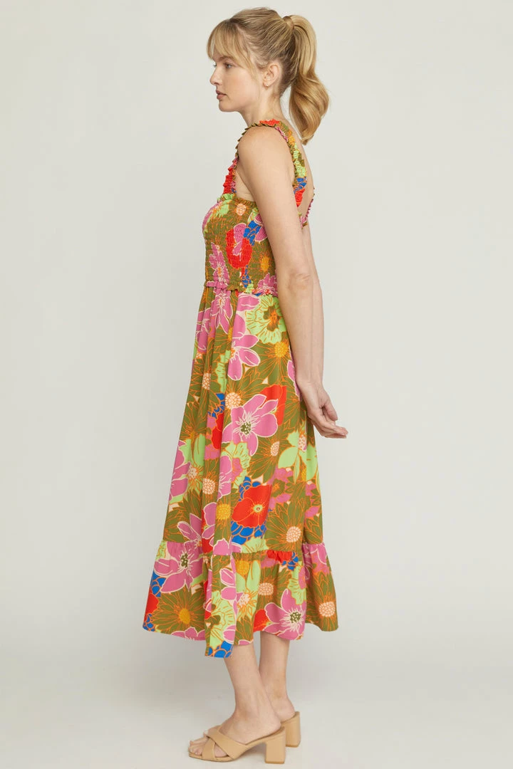 This vibrant floral print square neck midi dress is a must have for all of your summer occasions! Perfect for the beach or just a summer night date. Beautiful colored sleeveless dress featuring smocked bust and a ruffle skirt hem.