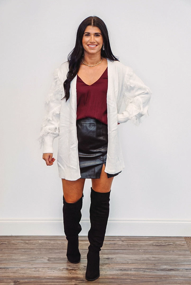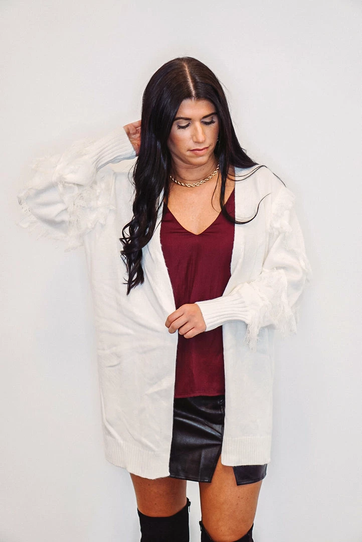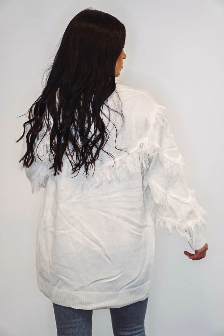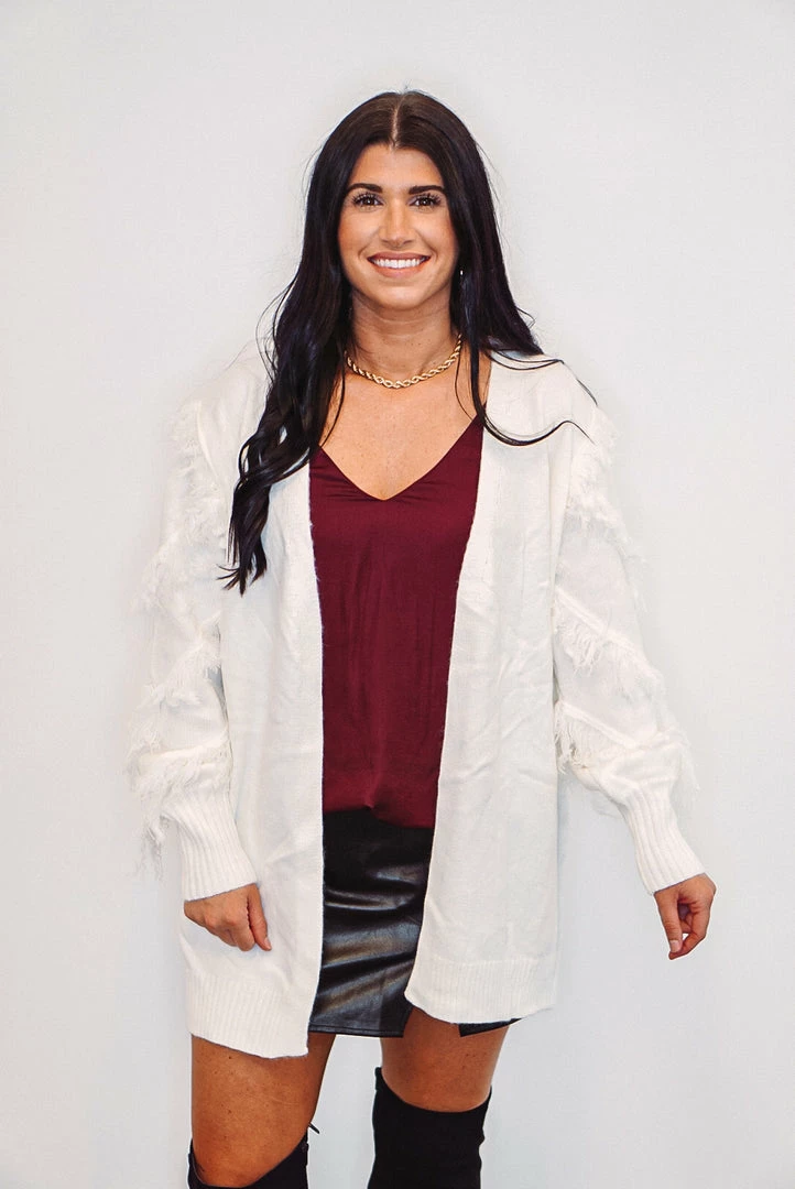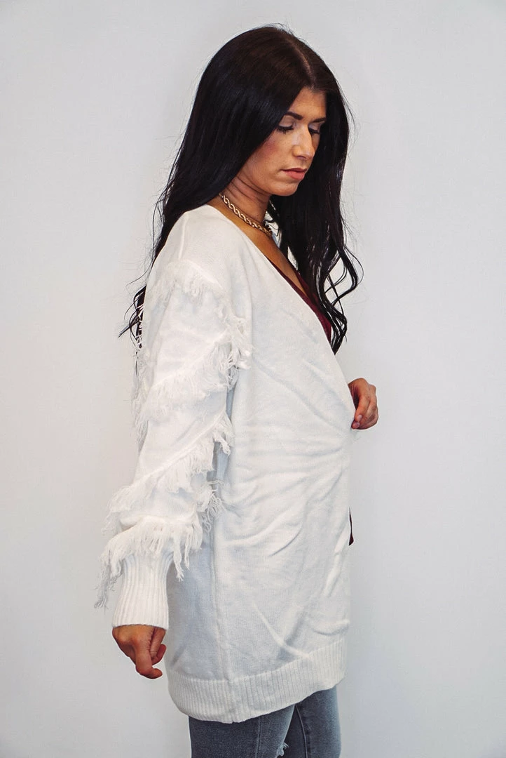 How fabulous is this timeless piece? This stylish little number features a classic ivory color with fringe details along the sleeves and across the shoulders in back. This cozy babe will keep you warm all season long. You can easily dress this cute cardigan up or down!Â