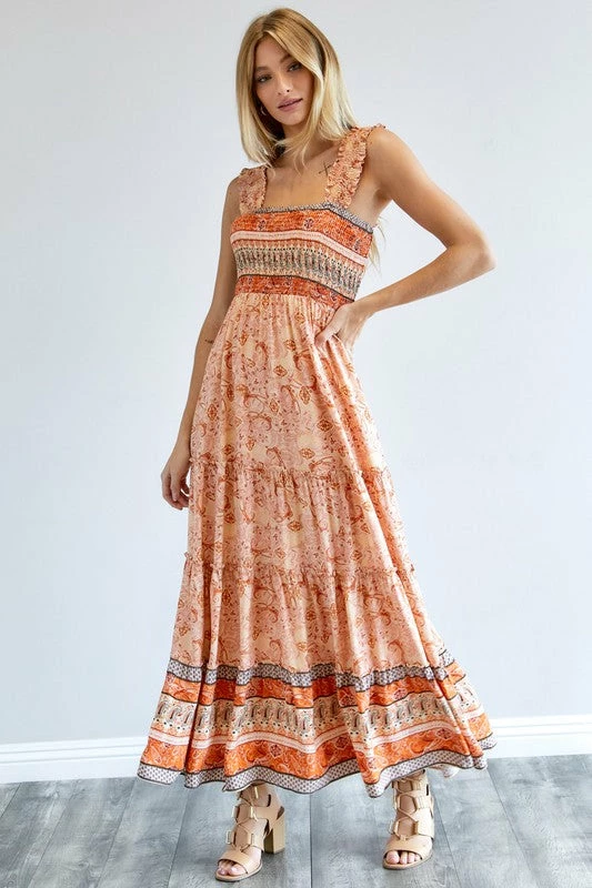 Flowy maxi dresses are all the rage right now and we are so here for it!! This adorable orange rust paisley dress is sleeveless with wide smocked straps, and features a square neckline, smocked bodice, and ruffle tiered layers. Wear her alone on warm days, then pair with a cute jacket when the weather cools! Colors: orange rust, peach, ivory, and black.