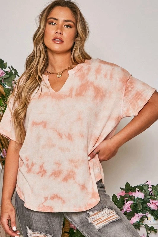 Peach Tie Dye Oversized Waffle Knit Short Sleeve Top