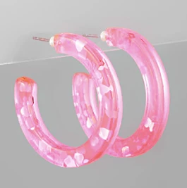 Hoop earrings are a must have this season! We are loving these pink celluloid hoops with the pink heart shimmer confetti inside. They are perfect for all of your upcoming events!