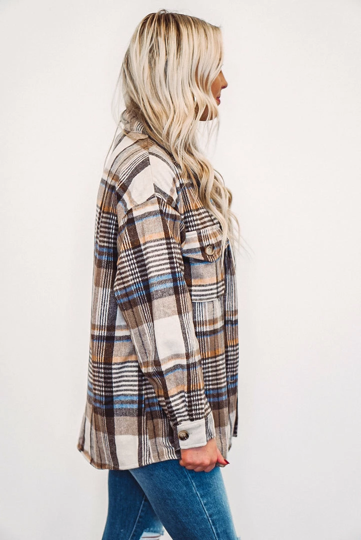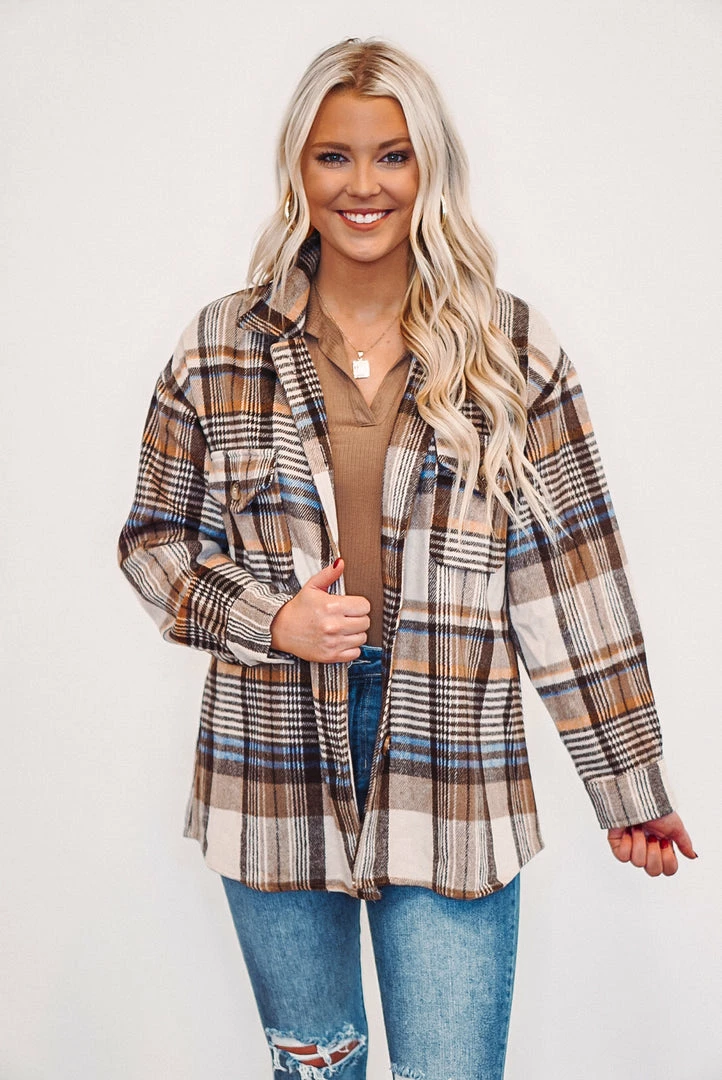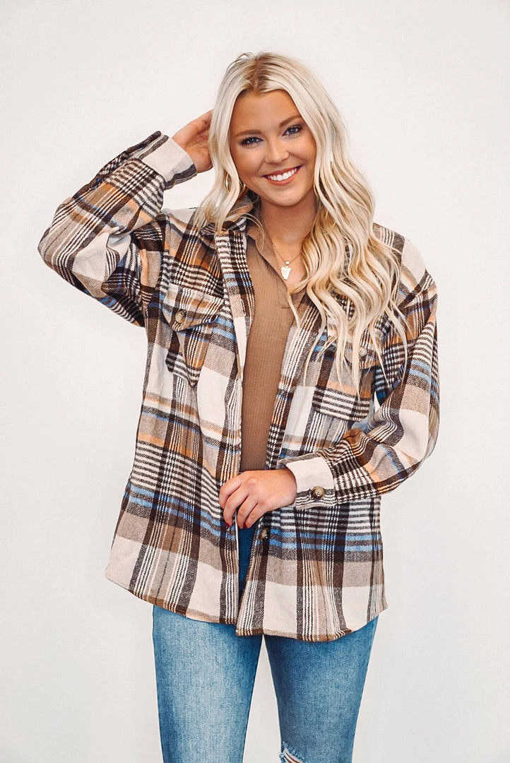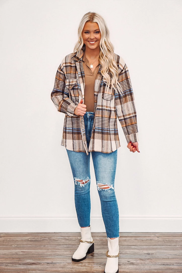 We are loving this brown plaid flannel shacket, it’s a must have trend this season! It features a button up style, button close two front chest pockets, and a thicker fabric to keep you warm and cozy. It’ll be the perfect addition to your wardrobe and great to layer with your bodysuits and jeans. Plaid colors are bown, tan, ivory, blue, and mustard…. a perfect combination!
