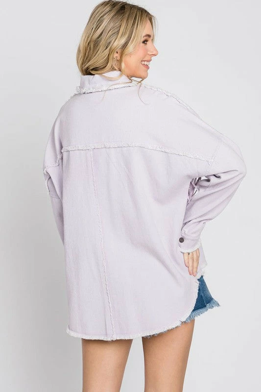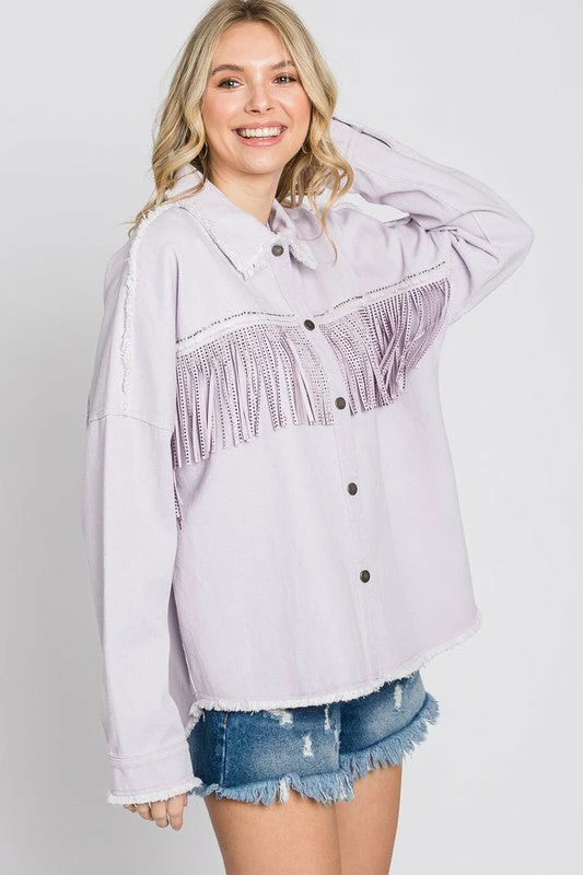 A fun, lightweight jacket with a TWIST! This lilac twill jacket is a MUST have to rock all year long! Jacket features rhinestone fringe across the chest, raw frayed seam details, slight hi-low bottom hemline, and a comfy relaxed fit. This babe is absolute perfection!