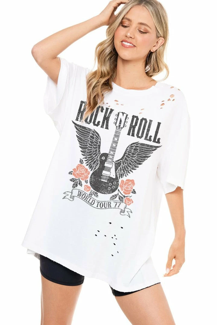 Trendy little must have tee! White graphic tee featuring an oversized fit, crew neckline, short sleeves and distressed hemlines. The words Rock N Roll written above a guitar with rose world tour ’77 design. Perfect with some biker shorts!Â
