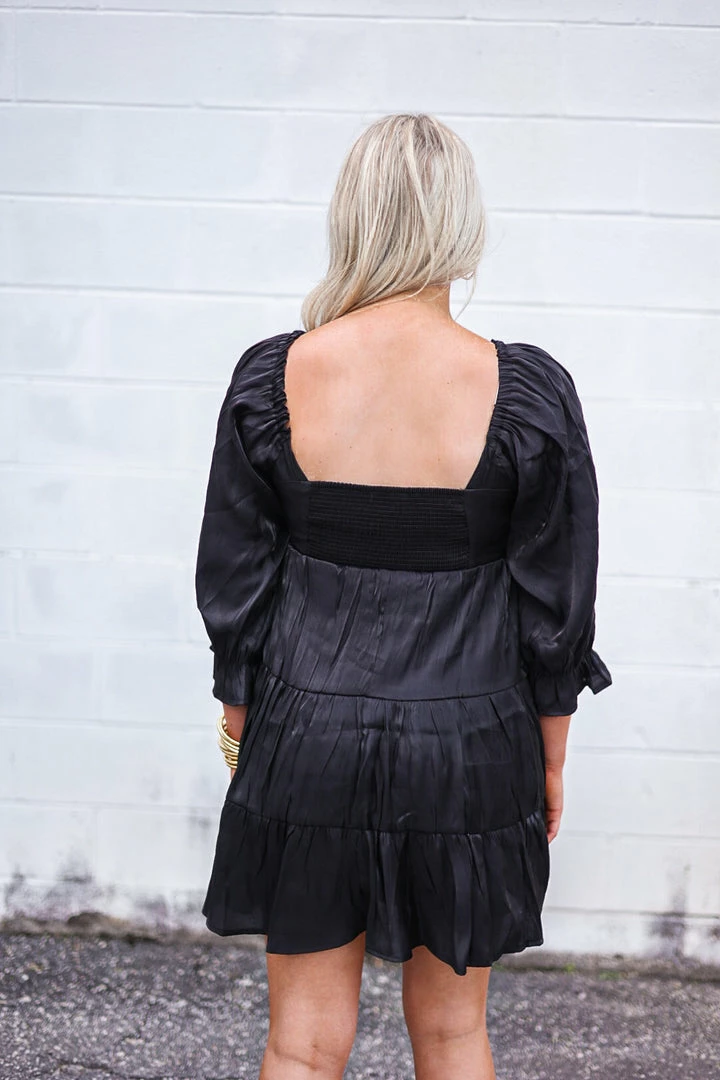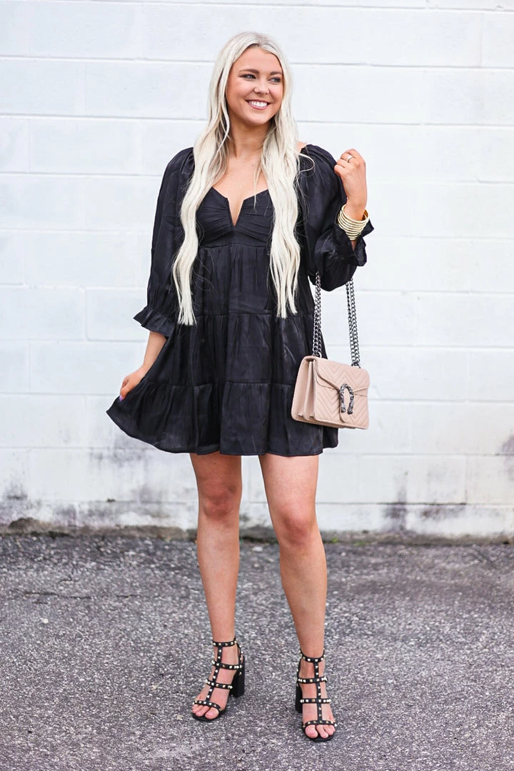Sweet meets sassy in this super cute black babydoll dress. Featuring an iridescent flowy fabric, tiered layers, wire insert v cut neckline, smocked back, and ruffled cuffed 3/4 length sleeves with elastic at the shoulder. This one will be perfect dressed up for all of your upcoming events, and is so pretty!Â