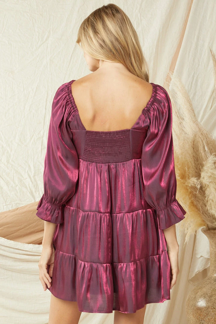 Sweet meets sassy in this super cute grape babydoll dress. Featuring an iridescent flowy fabric, tiered layers, wire insert v cut neckline, smocked back, and ruffled cuffed 3/4 length sleeves with elastic at the shoulder. This one will be perfect dressed up for all of your upcoming events, and is so pretty!Â
