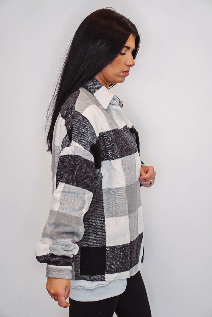 black grey and white checkered plaid flannel shacket