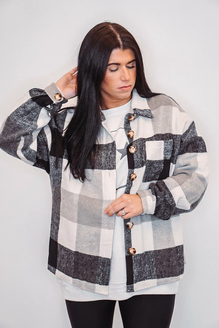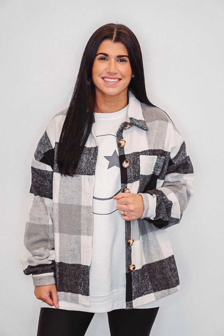 We are obsessed with this black, grey and white checkered plaid flannel shacket! It is definitely a must have this season! Featuring a front chest pocket, button front closure, button cuffed long sleeves, and a soft fabric to keep you cozy and trendy. She’s be the perfect addition to your wardrobe, and will look adorable paired with boots and booties!Â