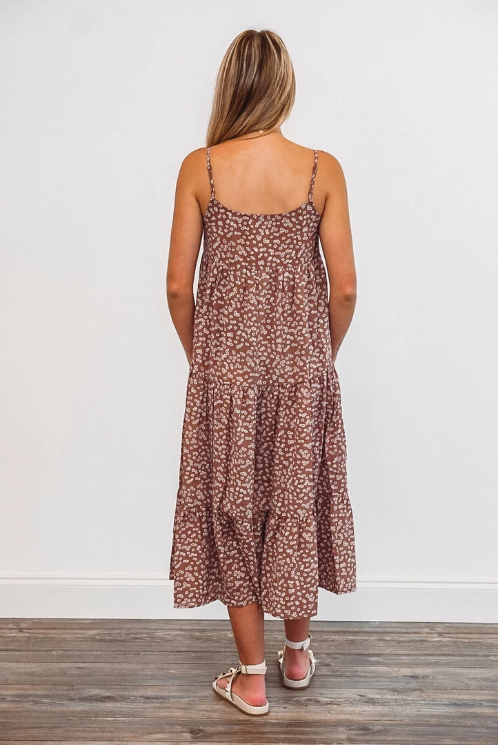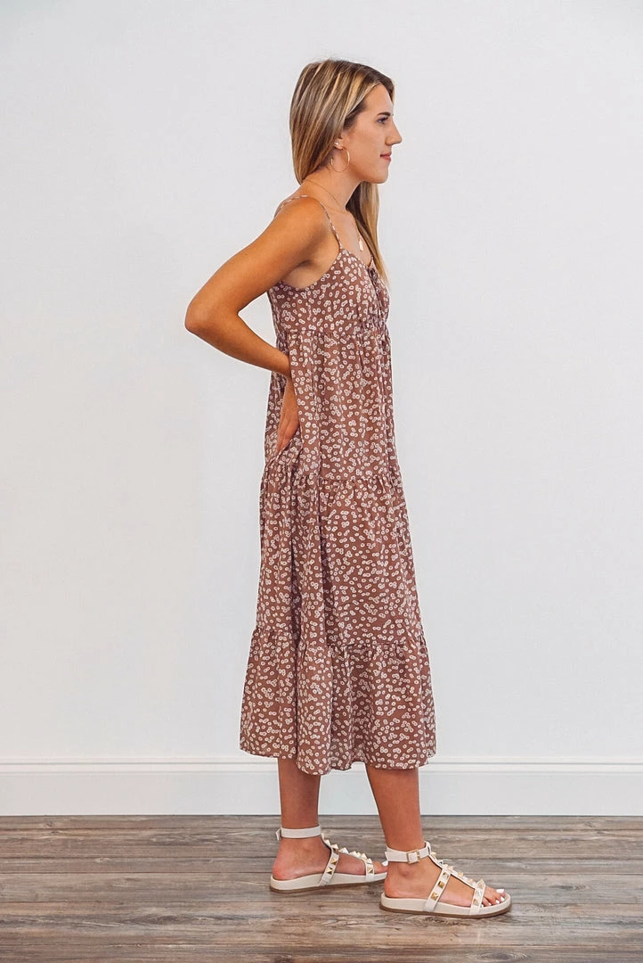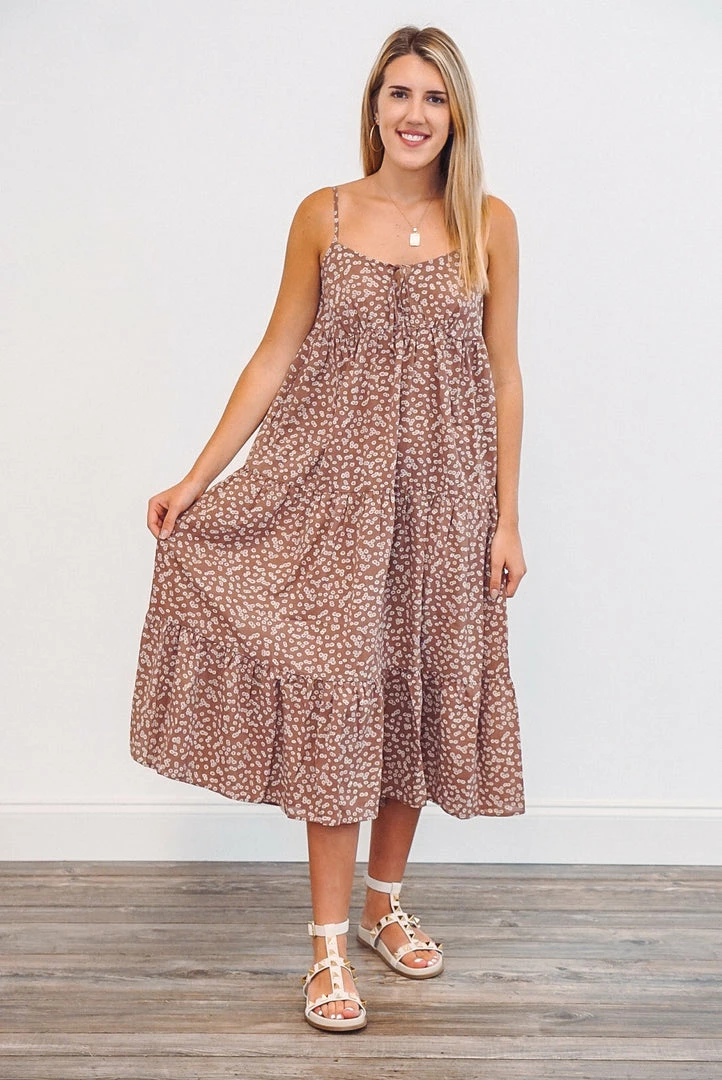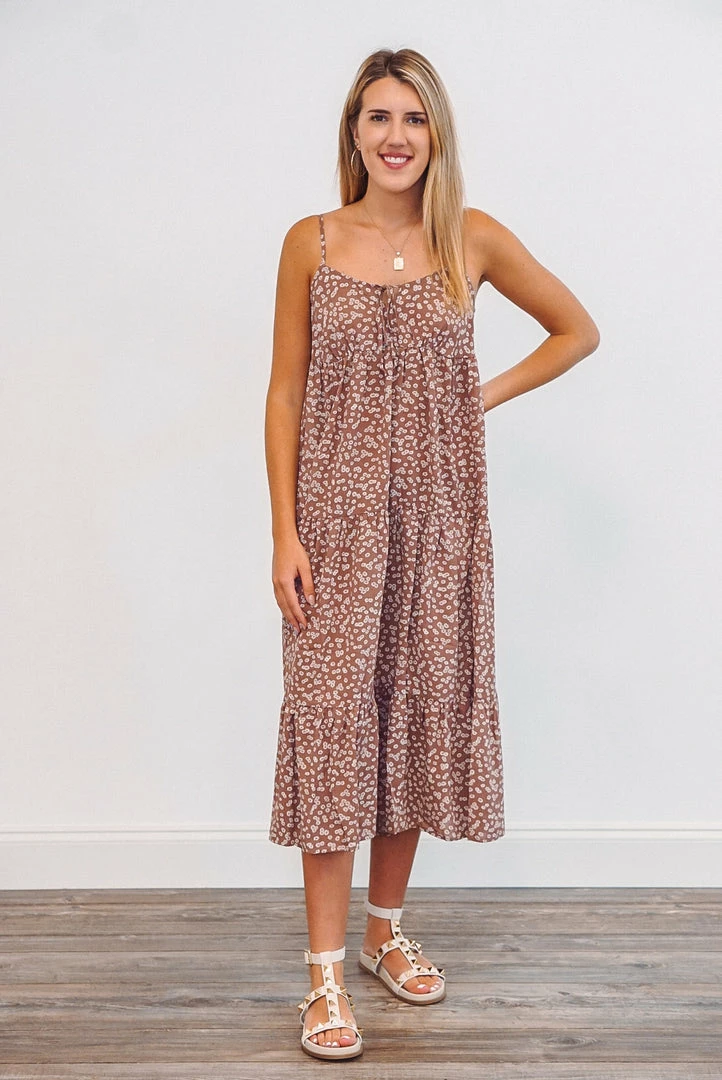 We love the Boho life! This super cute midi dress is dark mauve with ivory daisies and a tiered flowy silhouette. Featuring adjustable spaghetti straps, and self tie keyhole neckline. So cute and fun!Â