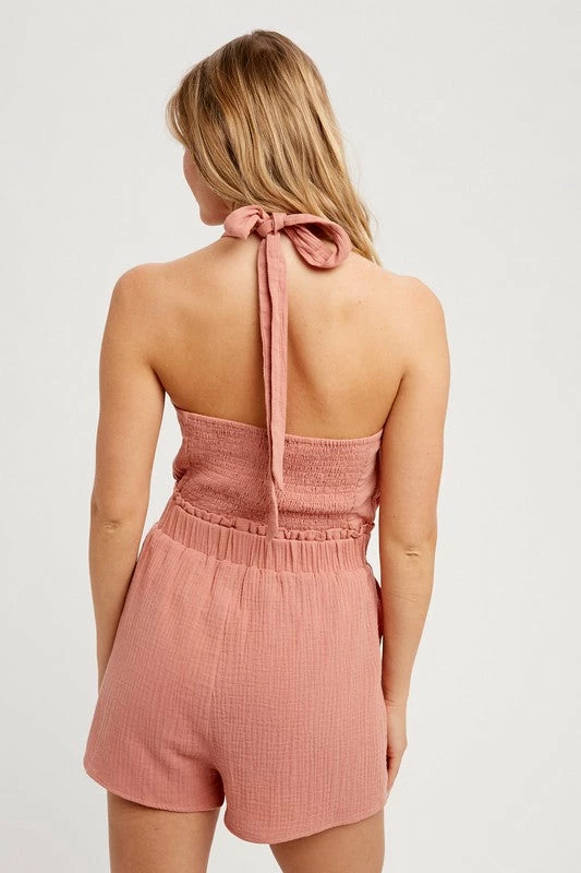 What a cute and fun romper!?! Terracotta crinkle gauze fabric, featuring a criss cross halter neck that ties in back, elastic waistband with ruffle detail, smocked back, and front pockets. This babe is so comfy, and super trendy!