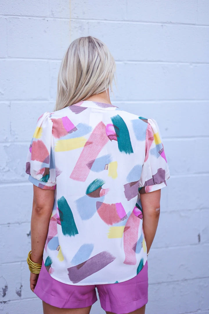 Ivory and multi color abstract painted print v neck blouse