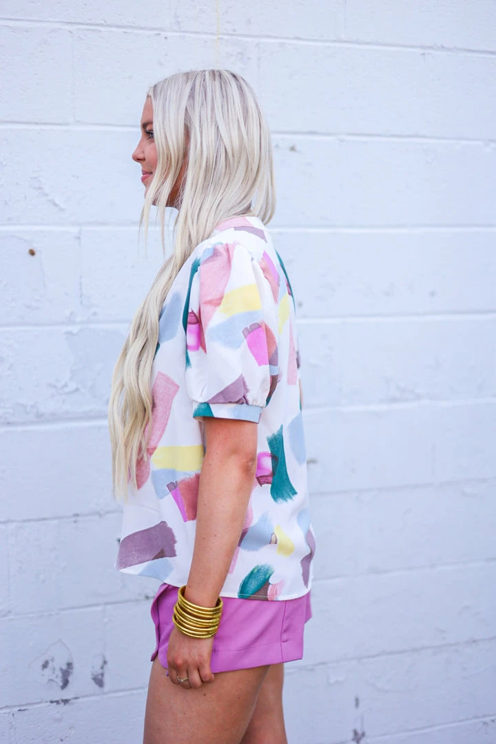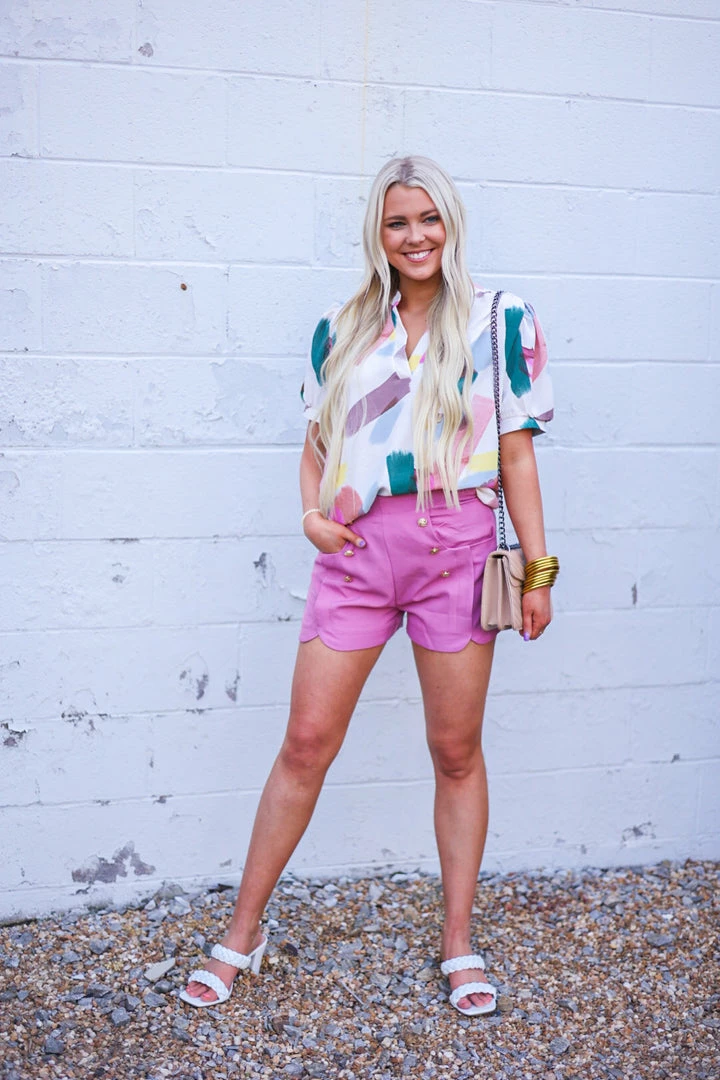 How pretty is this abstract painted print top!? Perfect for the upcoming seasons… just add your favorite jeans and booties, then shorts and sandals as the weather warms. Featuring a v neckline and gathered detail on the cuffed short sleeves. So cute! Colors: ivory, dark pink, dark blush, eggplant, sky blue, dark teal, and yellow.Â